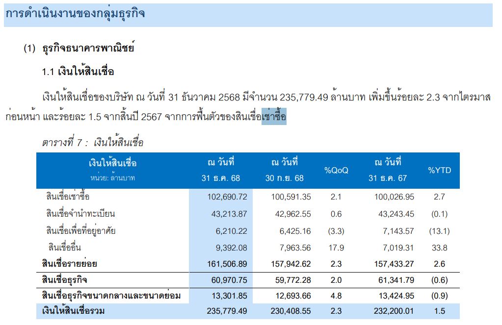 บริษัท ทิสโก้ไฟแนนเชียลกรุ๊ป จำกัด (มหาชน) หรือ TISCO โครงสร้างพอร์ตสินเชื่อ 1.สินเชื่อรายย่อย 68% 2.สินเชื่อธุรกิจ 25.6% 3.สินเชื่อธุรกิจ SME 6.3% จากสินเชื่อรายย่อย 68% จำแนกต่อได้เป็น 1.สิน