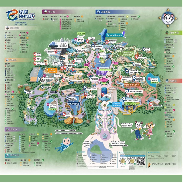 - มีอย่างน้อย 8 โซนธีม เช่น Dolphin Cove, Ocean Wonders (โซนอควาเรียมใหญ่), Rainforest Adventure, Polar Adventure, Walrus Mountain, Hero Island, Hengqin Ocean, Ocean Avenue