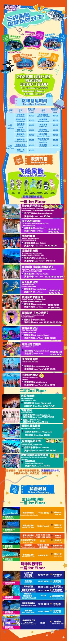 - 15 โซนธีม เช่น Cosmic World, Rainforest Planet, Space Park ผสมอควาเรียมสัตว์ทะเลหายากกับเครื่องเล่น (เช่น Deep Sea Submarine, Bermuda Adventure) และโชว์วิทยาศาสตร์สัตว์ทะเลในฮอลล์ใหญ่