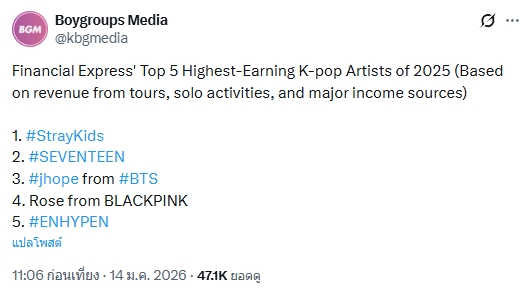 🔥 Stray Kids ติดโผอันดับ 1 จาก 5 อันดับศิลปิน K-pop ที่ทำรายได้สูงสุดในปี 2025 จากการจัดอันดับของ Financial Express (อ้างอิงจากรายได้จากการทัวร์คอนเสิร์ต กิจกรรมเดี่ยว และแหล่งรายได้หลัก)