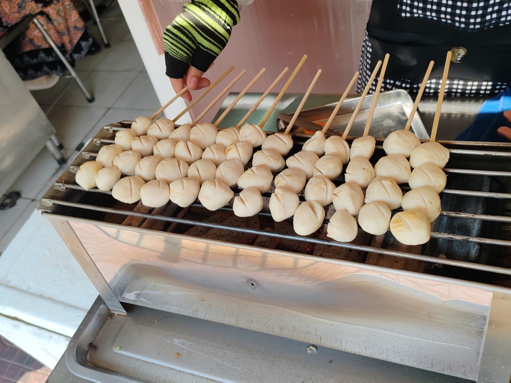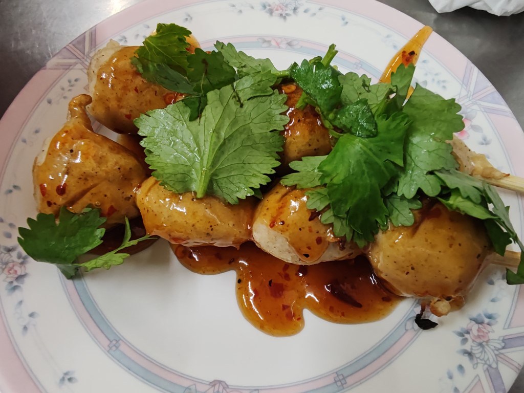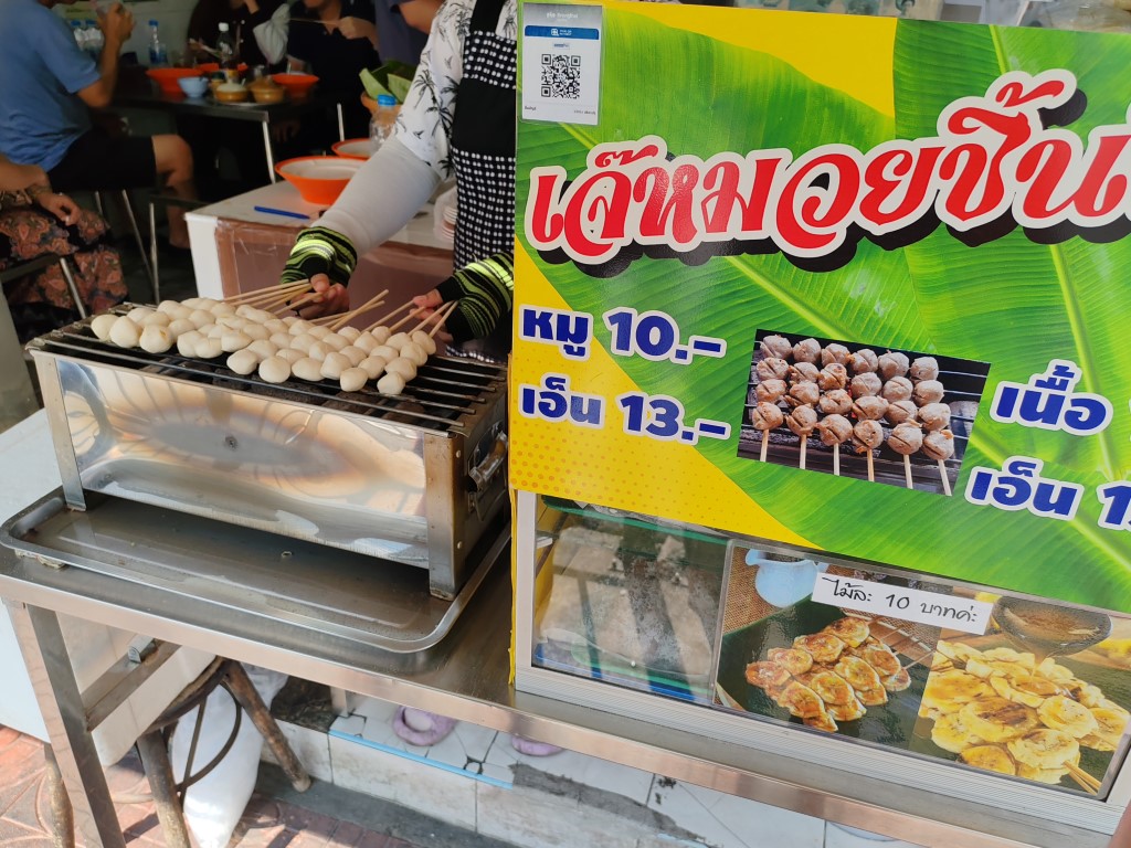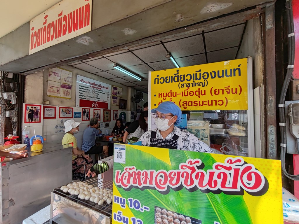 หน้าร้านมีขายลูกชิ้นหมู เอ็นหมูปิ้งด้วย นะ ระหว่างรอคิว น้องก็มารับออร์เดอร์ เราสั่งลูกชิ้นไว้เลย มีคุณป้าท่านนึงยืนคุยกับ ซ้อผม ป้าแกบอกว่าแกนั่งรถเมล์มามาไกลมาก จาก สมุทรปราการ อยากกิน อร่อย ต้องมา