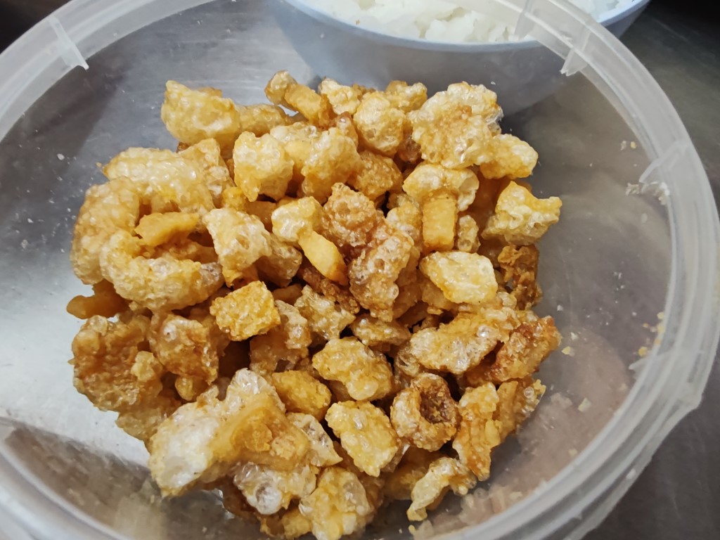 ลืมไป มีพระเอกต้องมีพระรอง ได้แคบหมูป๊อบมาจากอยุธยา ผมเลยติดมาด้วย (ที่ร้านไม่มีขายแคบหมูนะครับ พกไปได้ พี่คนที่ขายลูกชิ้นยังบอก เออดีเลยอะพกมาด้วย แจ่มๆ) โปะลงไป