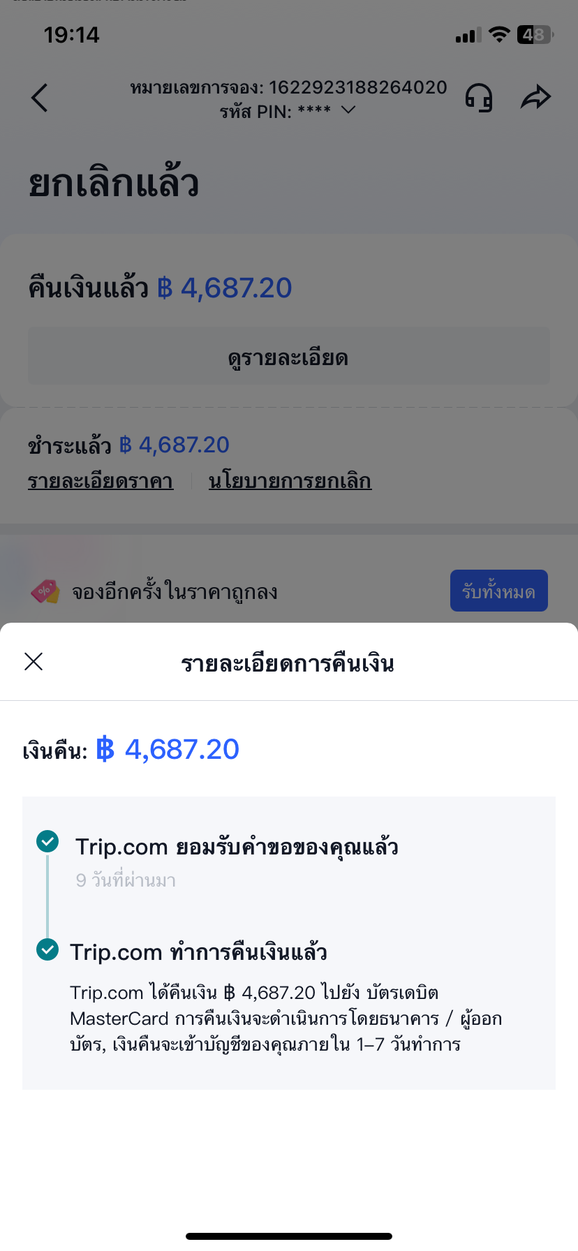 ยกเลิกที่พักใน trip.com ตัดบัตร MasterCard แอปบอกใช้ระยะเวลาดำเนินการ 1-7 วันไม่รวมวันหยุด ผ่านไป 9 วัน ต้องติดต่อใคร