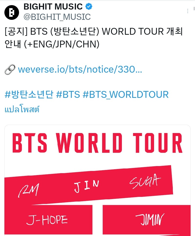 [BTS] ผ่านไป 24 ชม.หลังประกาศ WORLD TOUR จากบัญชีออฟฟิศเชียล Big hit ใน x มียอดวิว 30.5ล้าน!!!