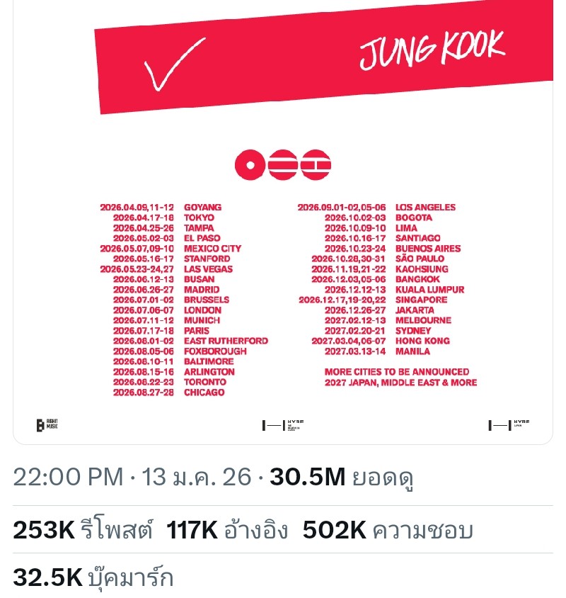 BTS เตรียมสร้างสถิติการแสดงมากที่สุดในประวัติศาสตร์ของ K-pop !! World Tour 79 รอบการแสดง ใน 34 เมืองทั่วโลก เฉพาะปี 2026