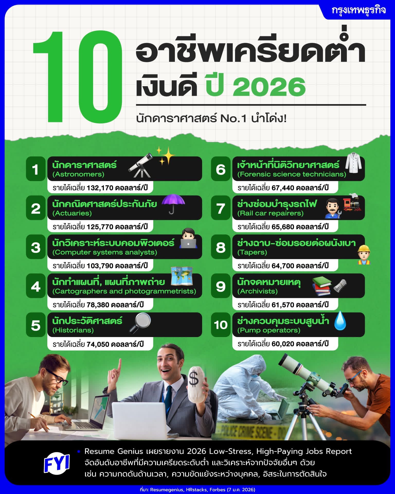 แต่สำหรับโลกการทำงานปี 2026 มีข่าวดีสำหรับคนทำงานคือ "เงินเดือนสูง" ไม่จำเป็นต้องแลกมาด้วย "ความเครียดสะสม" เสมอไป เพราะจากการวิเคราะห์เจาะลึกในรายงาน "2026 Low-Stress, High-Paying Jobs Report" ของ Resume Genius พบว่า มีหลายอาชีพที่ให้ผลตอบแทนระดับหกหลัก โดยที่ยังรักษาความสงบในใจไว้ได้