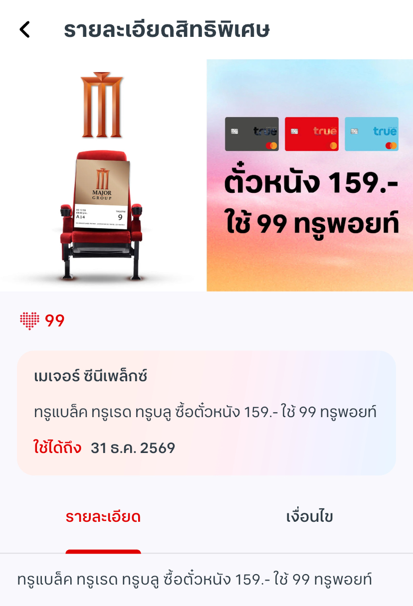 ขอสอบถามเรื่อง ใช้ 99 True Points แลกส่วนลด ตั๋วmajor 1 ที่นั่ง+ป๊อปคอร์นกับน้ำ ต้องมีค่าบริการรายเดือนเท่าไรขึ้นไปครับ