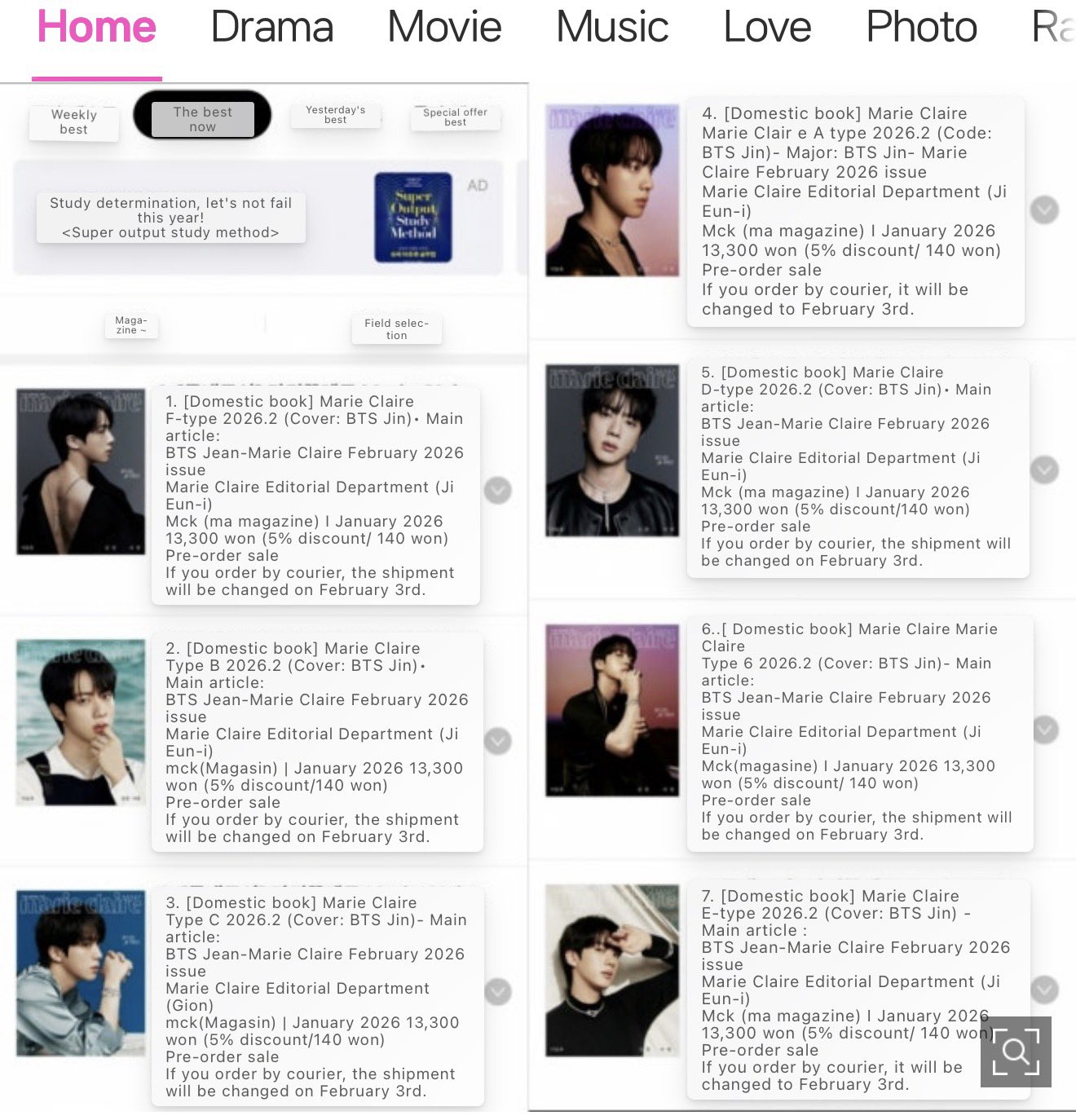 กวาดอันดับ 1 ยอดขายทั้งแบบเรียลไทม์ รายสัปดาห์ และรายเดือนสำหรับนิตยสาร Marie Claire Korea เดือน ก.พ. ที่ BTS Jin ขึ้นปก