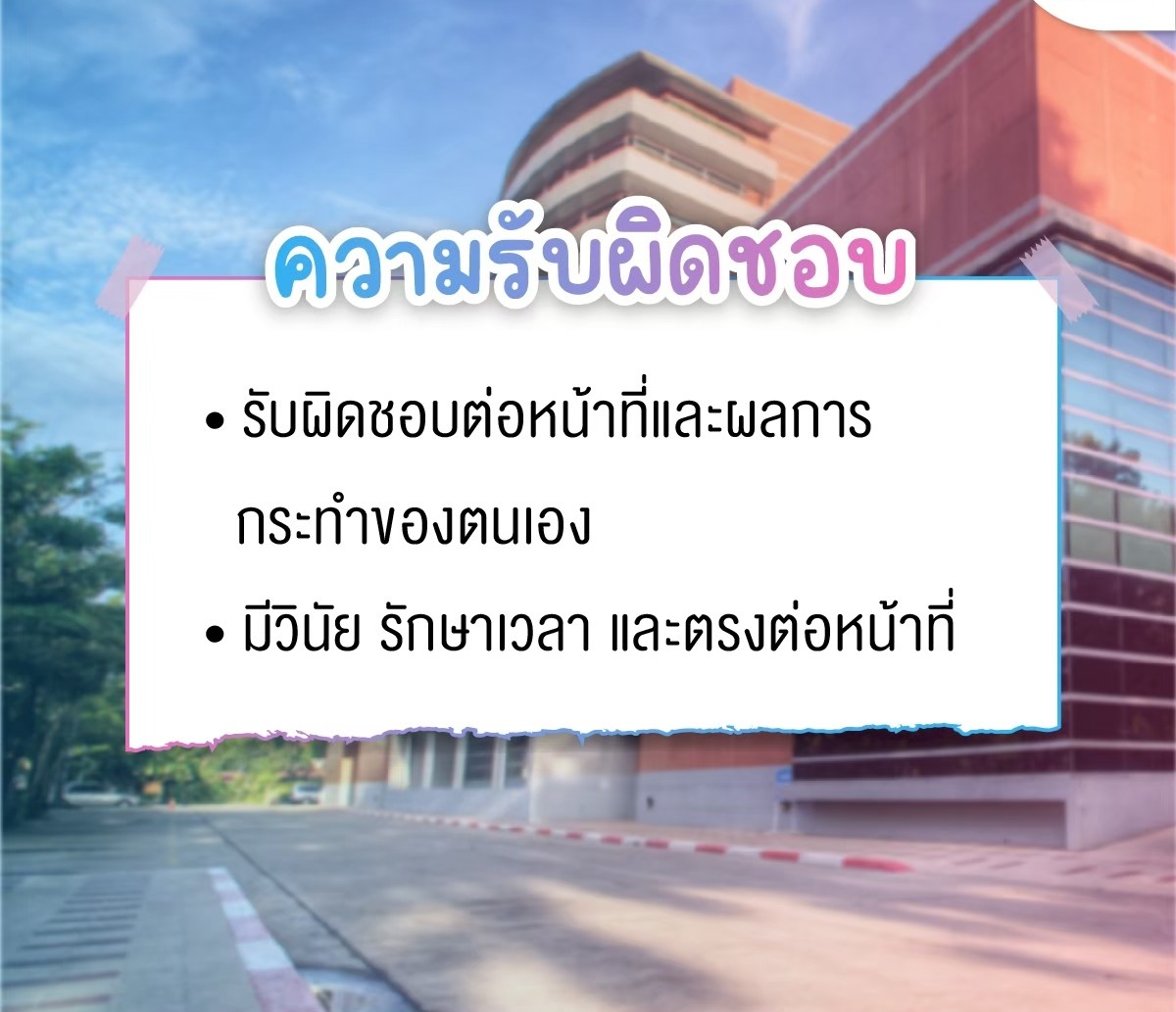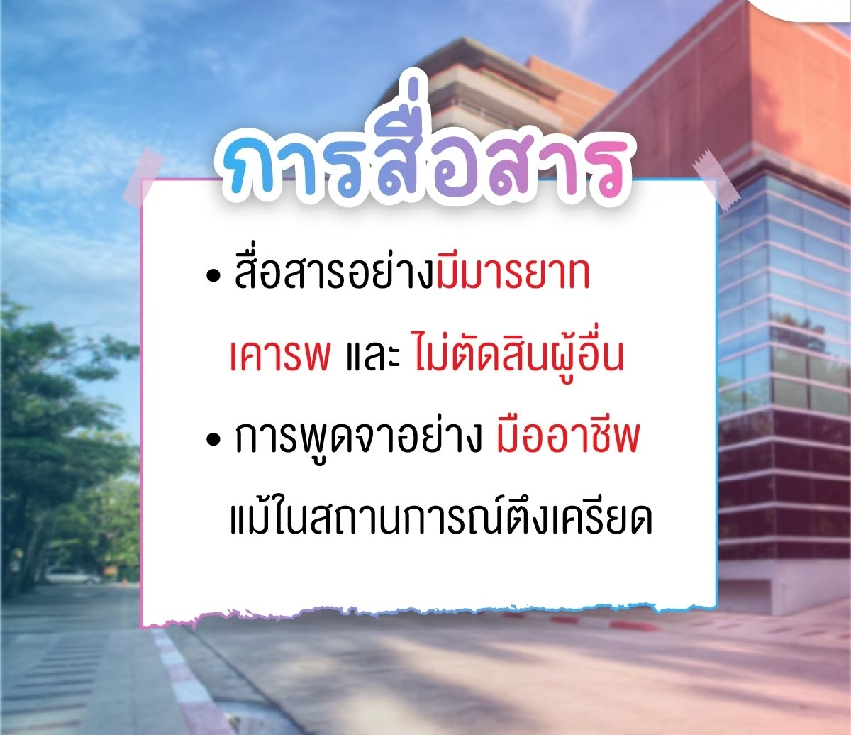• Professionalism: การควบคุมอารมณ์เมื่อถูกต่อว่า หรือการยอมรับความผิดพลาดของตนเอง