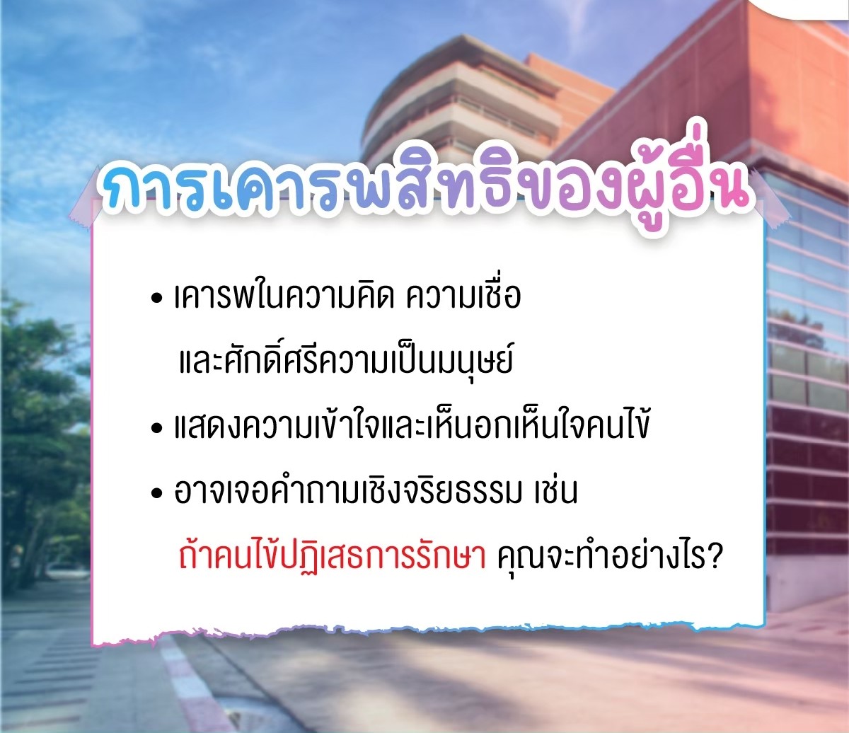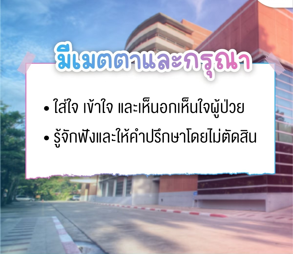 • Humanity: การมองคนไข้เป็น "มนุษย์" ไม่ใช่แค่ "เคส" การรักษา
