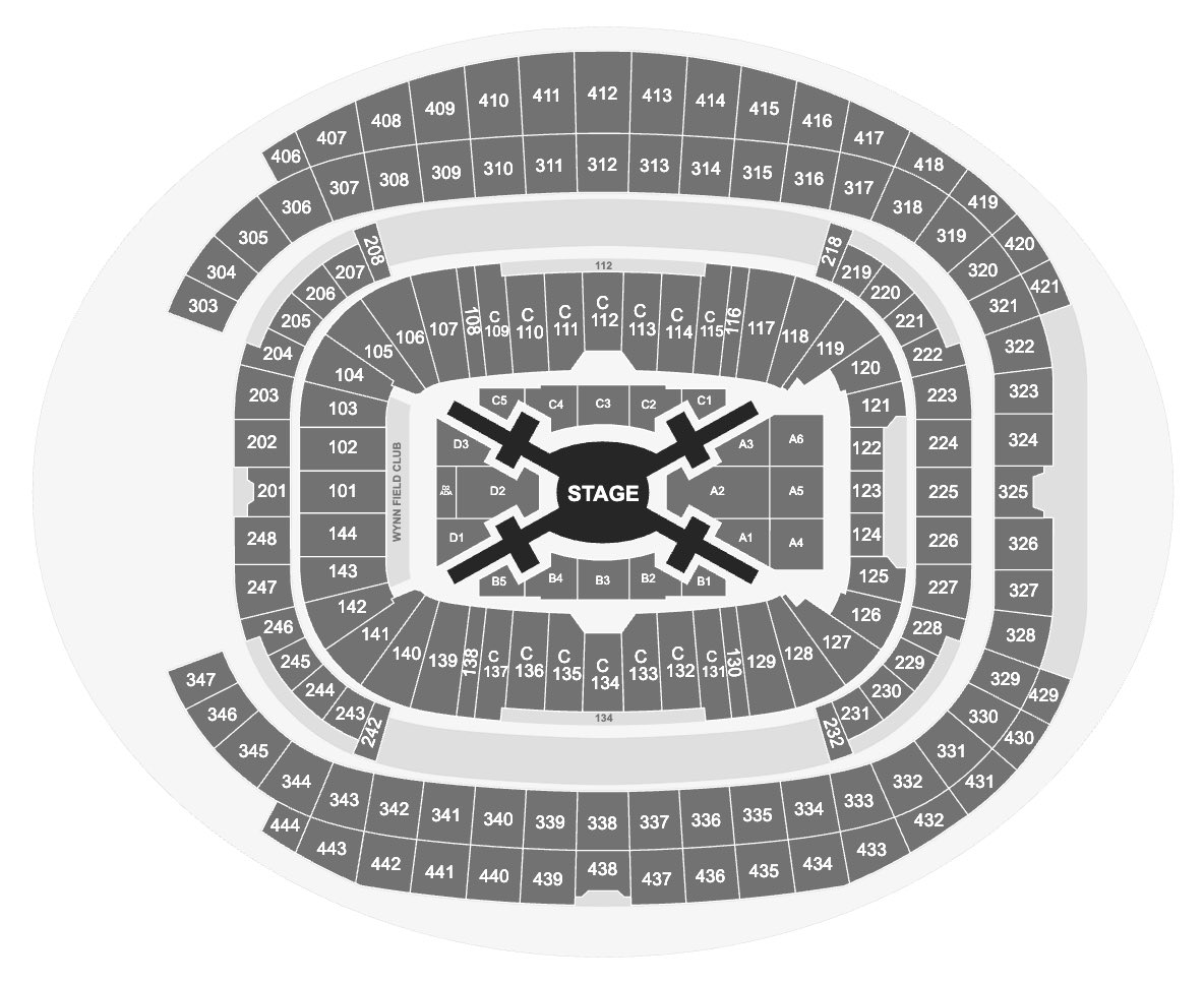 - Allegiant Stadium (Las Vegas): สนามนี้มีลักษณะปิดล้อมมิดชิด การใช้เวทีกลางสนามจะทำให้รองรับผู้ชมได้เต็มพิกัดของโครงสร้างสนาม คือประมาณ