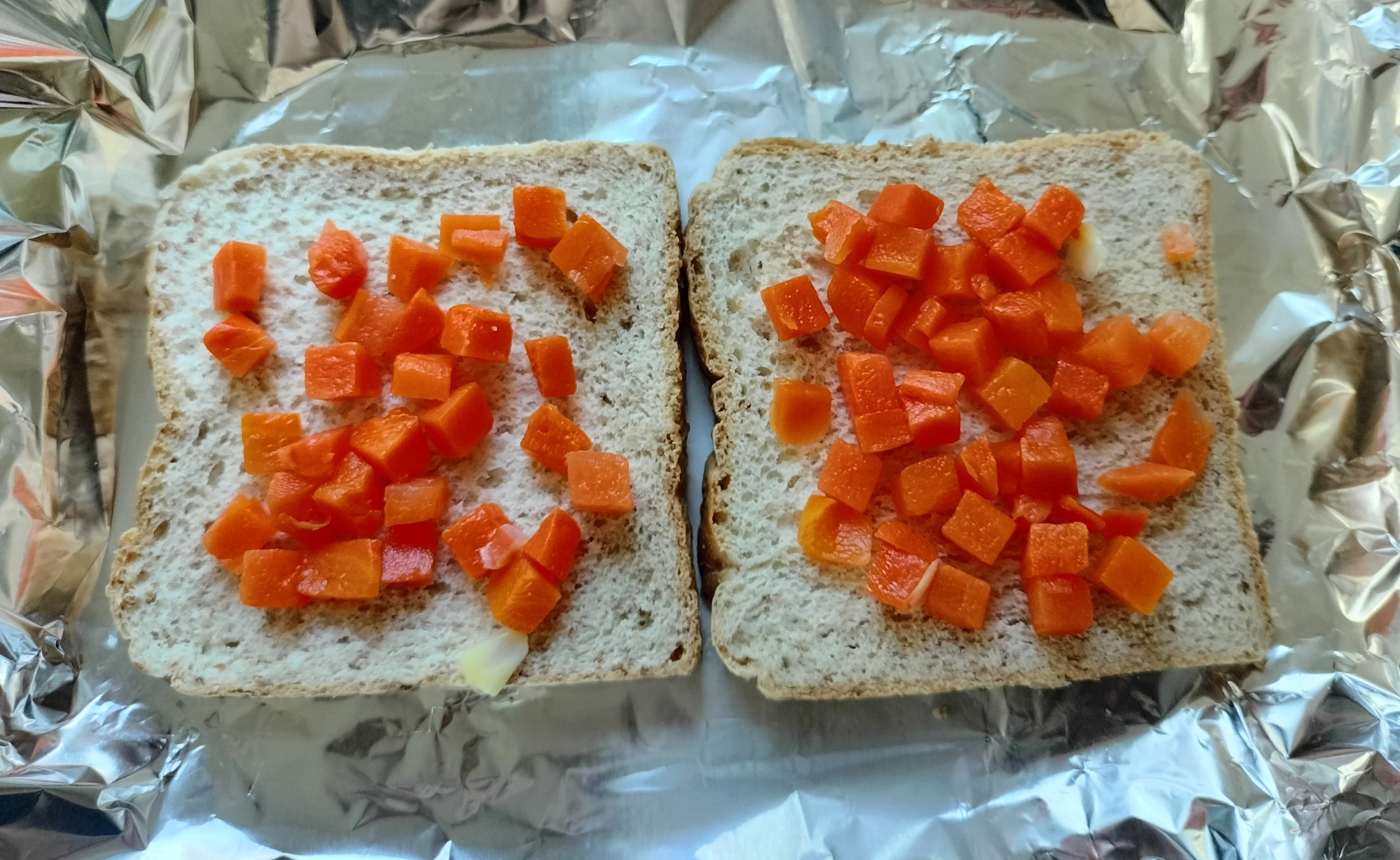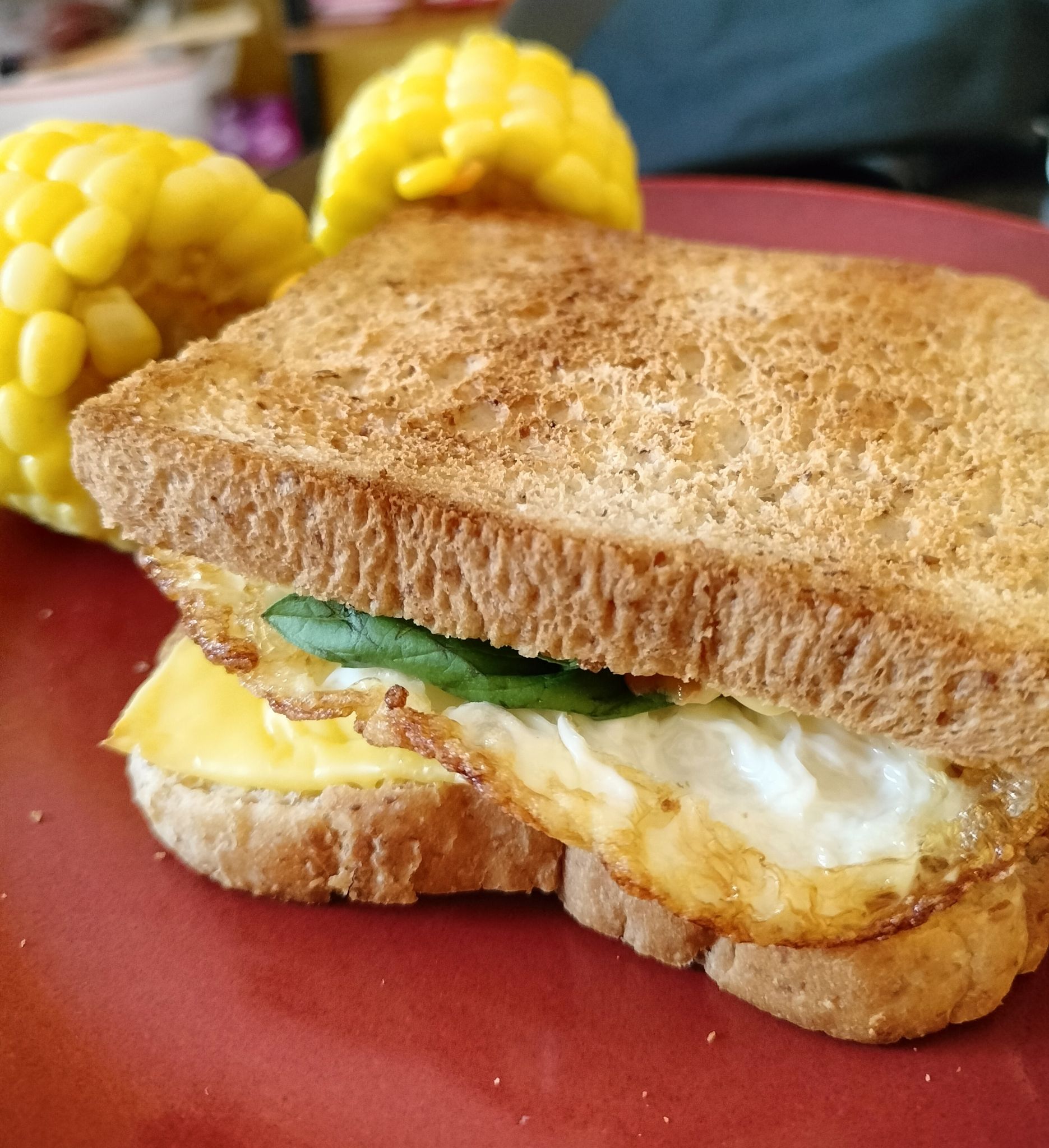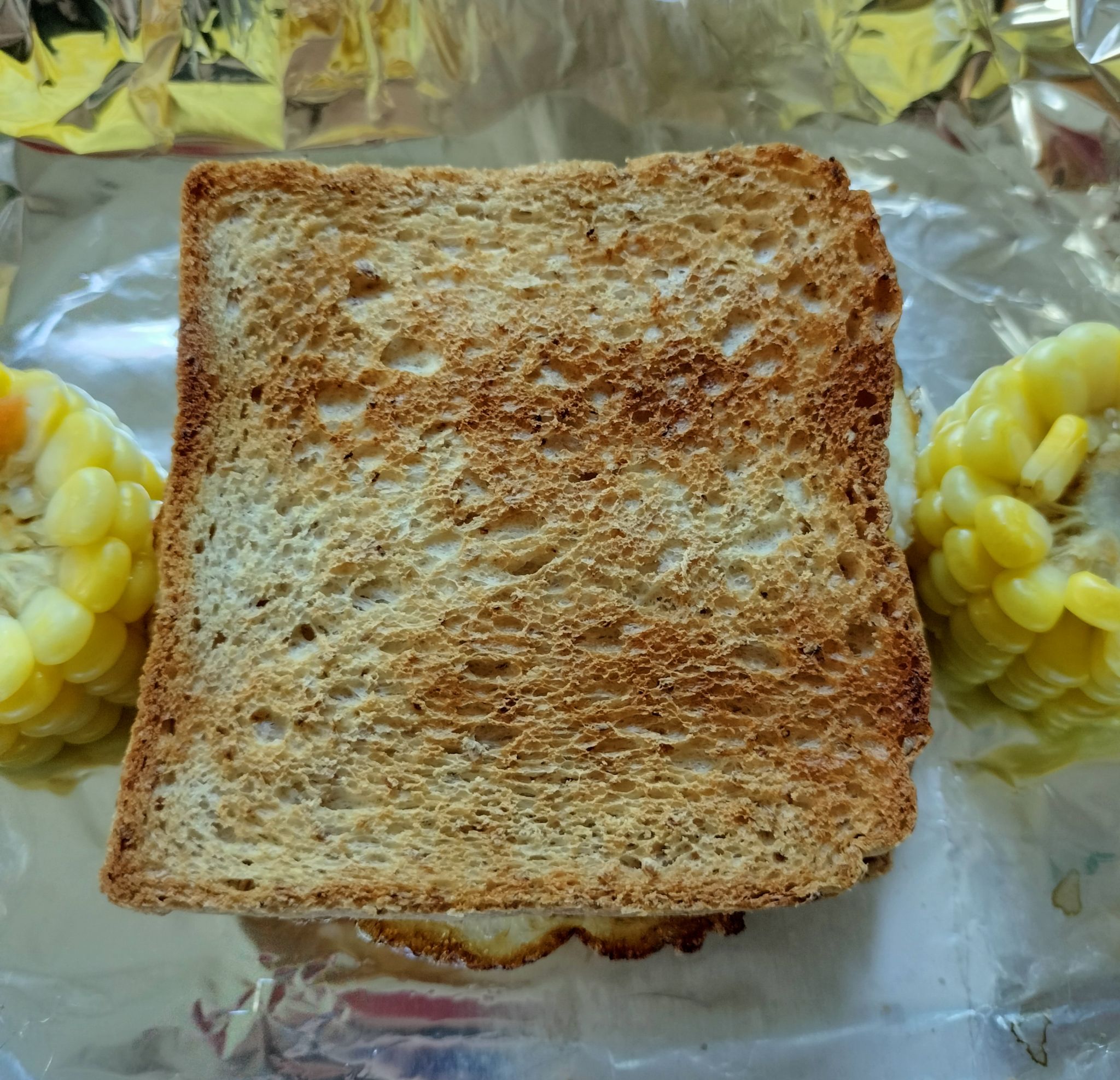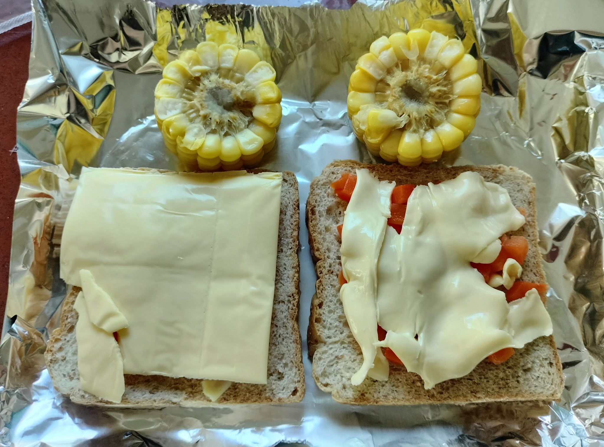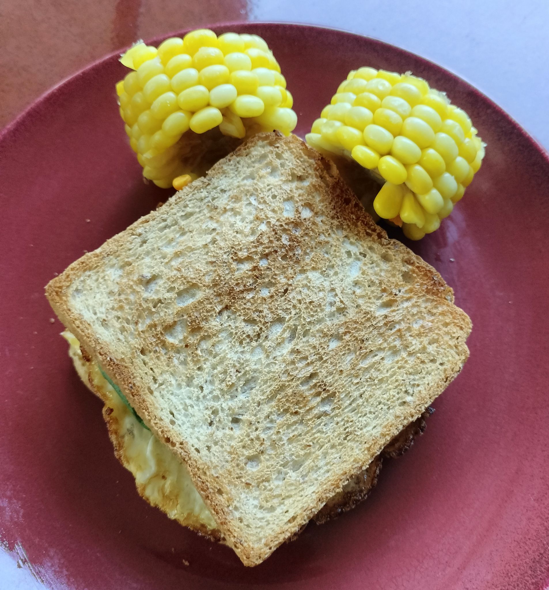เช้านี้หยิบขนมปังแผ่นที่เก็บในช่องแข็ง, ไข่ไก่ฟองสุดท้าย, ชีสเหลือสองแผ่นสุดท้าย, แครอทต้มสุก, ข้าวโพดหวานต้มสุก แล้วเอามาทำแซนวิชกินเป็นมื้อเช้าค่ะ