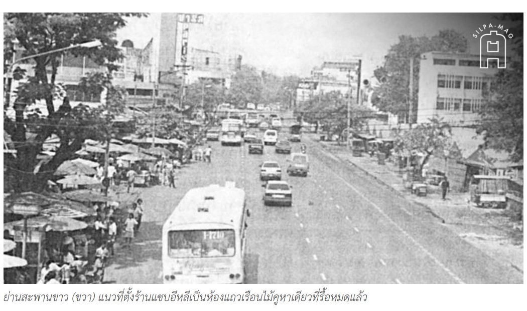 ย่านสะพานขาว (ขวา) แนวที่ตั้งร้านแซบอีหลีเป็นห้องแถวเรือนไม้คูหาเดียวที่รื้อหมดแล้ว