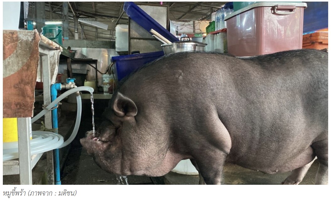 หมูที่คนในพื้นที่เลี้ยง คือ “หมูขี้พร้า” หมูพื้นเมืองพันธุ์ไหหลำ รูปร่างอ้วนท้วน ท้องยาน หลังแอ่น หน้าสั้น จมูกสั้น ตัวมีสีดำกับขาว