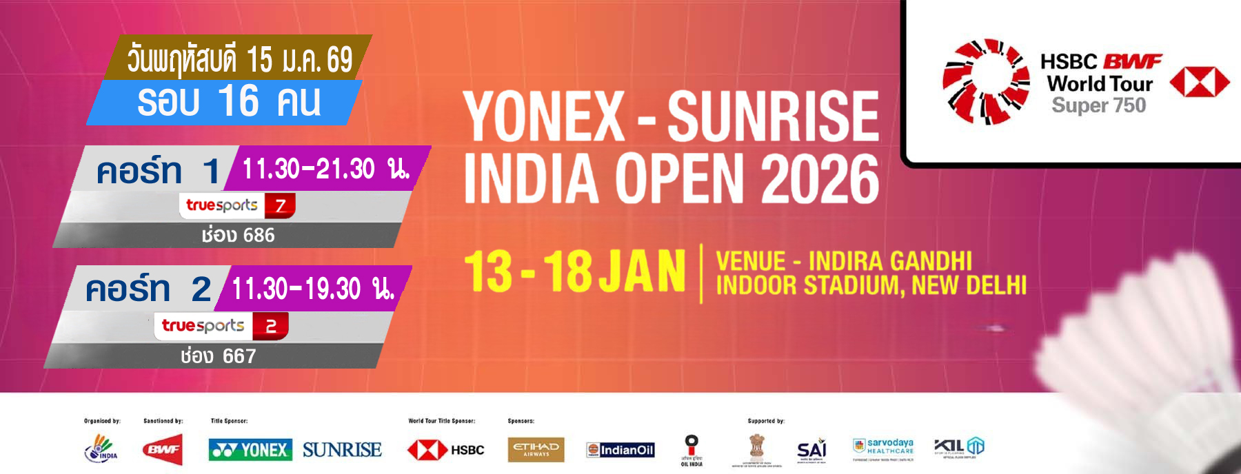เชียร์สด ! แบดมินตันYONEX-SUNRISEIndiaOpen 2026 : รอบ 16 คน (15 ม.ค. 69) (คู่แรก 11.30 น.)