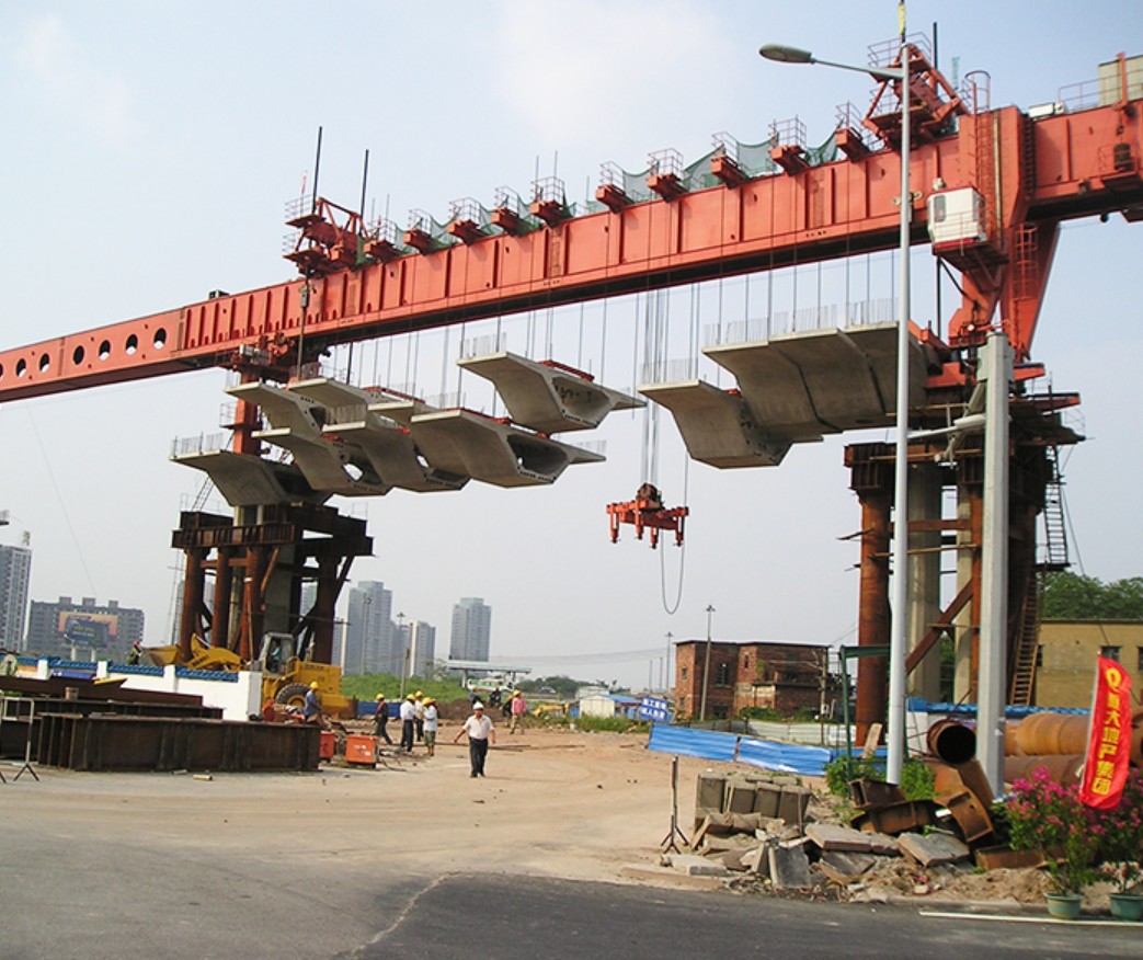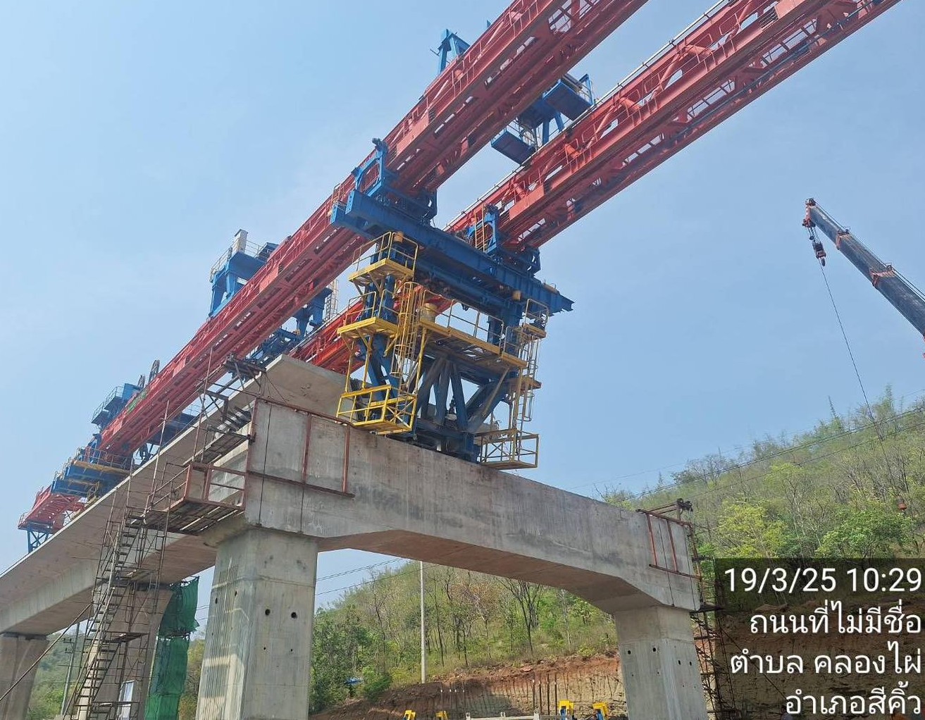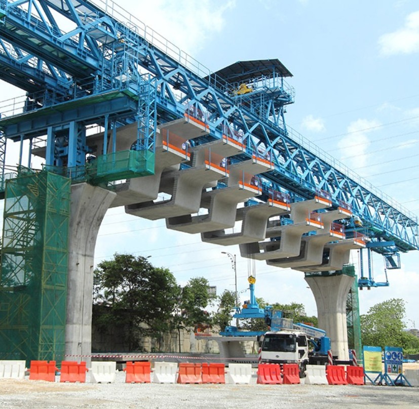 ภาพของเครน Launching Truss กำลังยกชิ้นงาน block คอนกรีตเพื่อเตรียมเชื่อมกันเป็นคานระหว่างตอม่อ