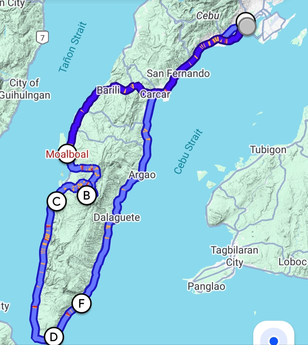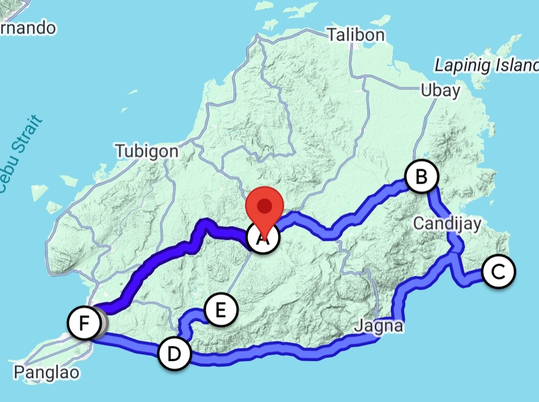 เส้นทางแว้นที่Bohol ระยะทางราว 300 กิโลเมตร จุด A คือ Chocolate Hills จุด C คือ Anda White Long Beach จุด E คือ Bohol Tarsier Conservation Area จุด F คือ Tagbilaran
