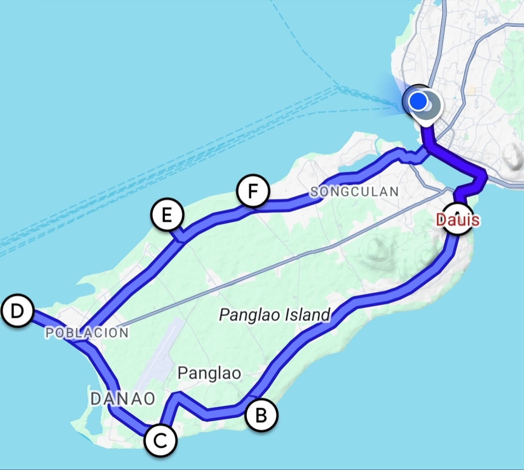 จุดB คือ Dumaluan Beach จุด C คือ Alona Beach จุด D คือ Doljo Beach จุด E คือ Napaling Reef และ จุดF คือ Hinagdanan Cave