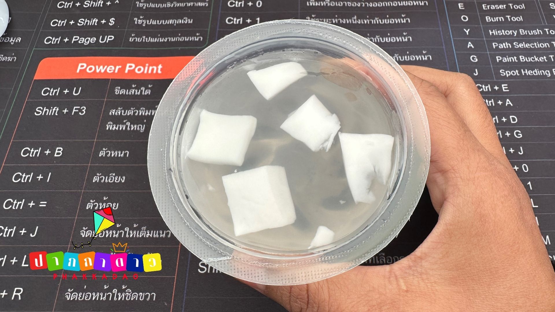 ข้างในเป็นน้ำใสๆ มีชิ้นเนื้อมะพร้าวสีขาวหั่นเป็นชิ้นพอดีคำลอยอยู่