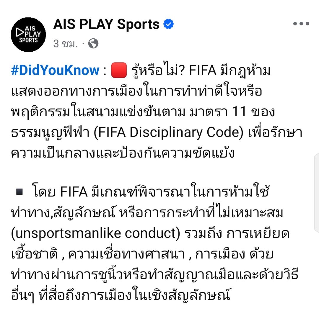 #DidYouKnow : 🟥 รู้หรือไม่? FIFA มีกฎห้ามแสดงออกทางการเมืองในการทำท่าดีใจหรือพฤติกรรมในสนามแข่งขัน