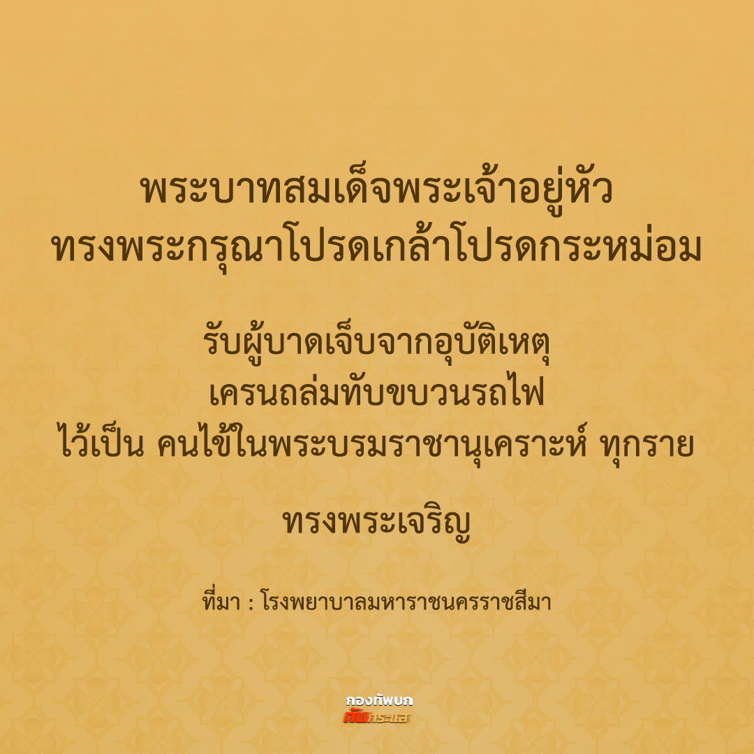 💛🙏 “ในหลวง” โปรดเกล้าฯ รับผู้บาดเจ็บจากอุบัติเหตุเครนถล่มทับขบวนรถไฟไว้เป็น “คนไข้ในพระบรมราชานุเคราะห์” ทุกราย