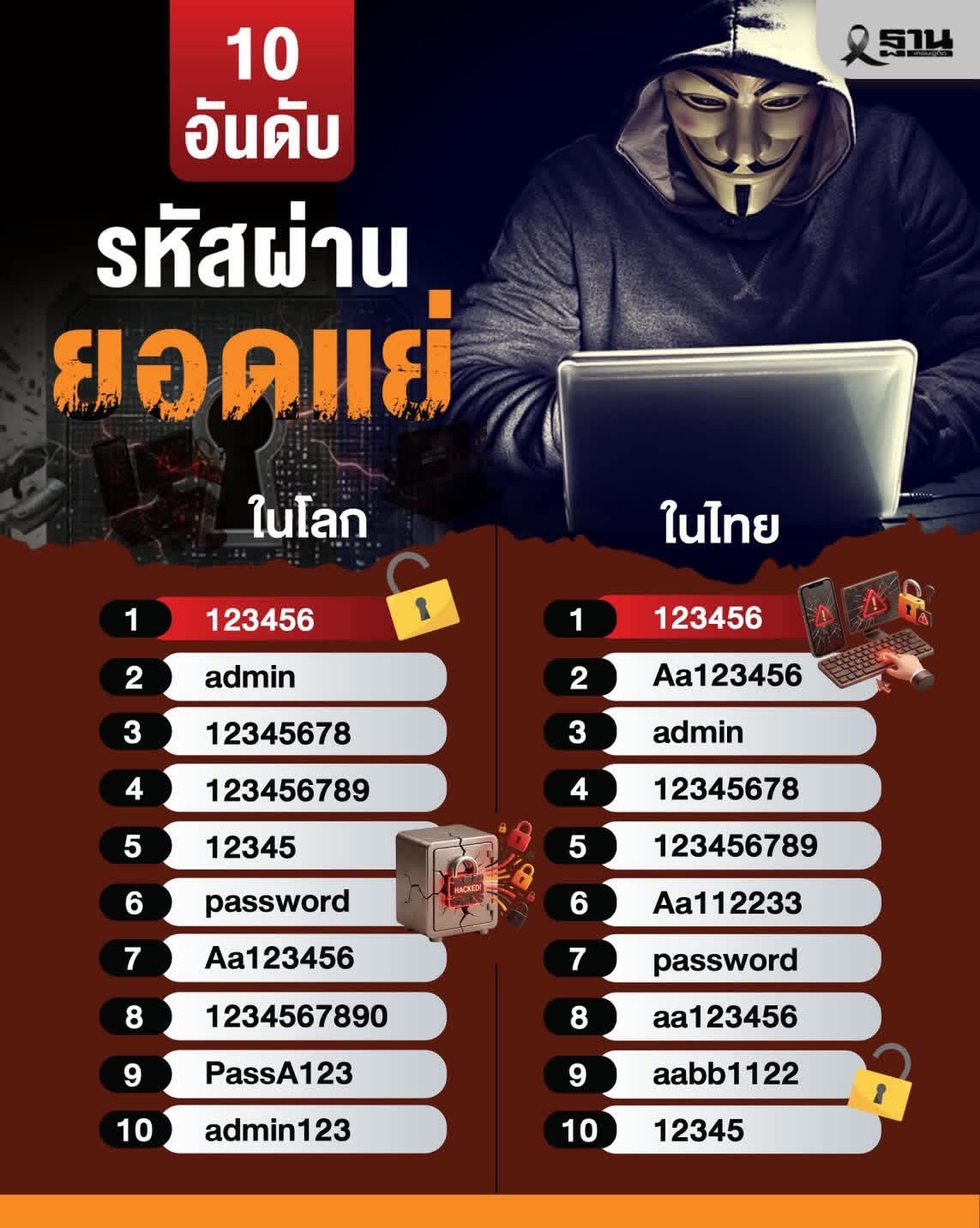 การตั้งรหัสผ่านที่คาดเดาง่ายยังคงเป็นหนึ่งในสาเหตุหลักที่ทำให้บัญชีผู้ใช้งานตกเป็นเป้าหมายของการโจมตีทางไซเบอร์ สำนักงานคณะกรรมการการรักษาความมั่นคงปลอดภัยไซเบอร์แห่งชาติ (สกมช.) เปิดเผย 10 อันดับรหัสผ่านที่เสี่ยงถูกแฮกมากที่สุดในปีนี้ ไม่ว่าจะเป็น "123456" หรือคำทั่วไปอย่าง "admin" และ "password" ที่พบทั้งในระดับโลกและประเทศไทย