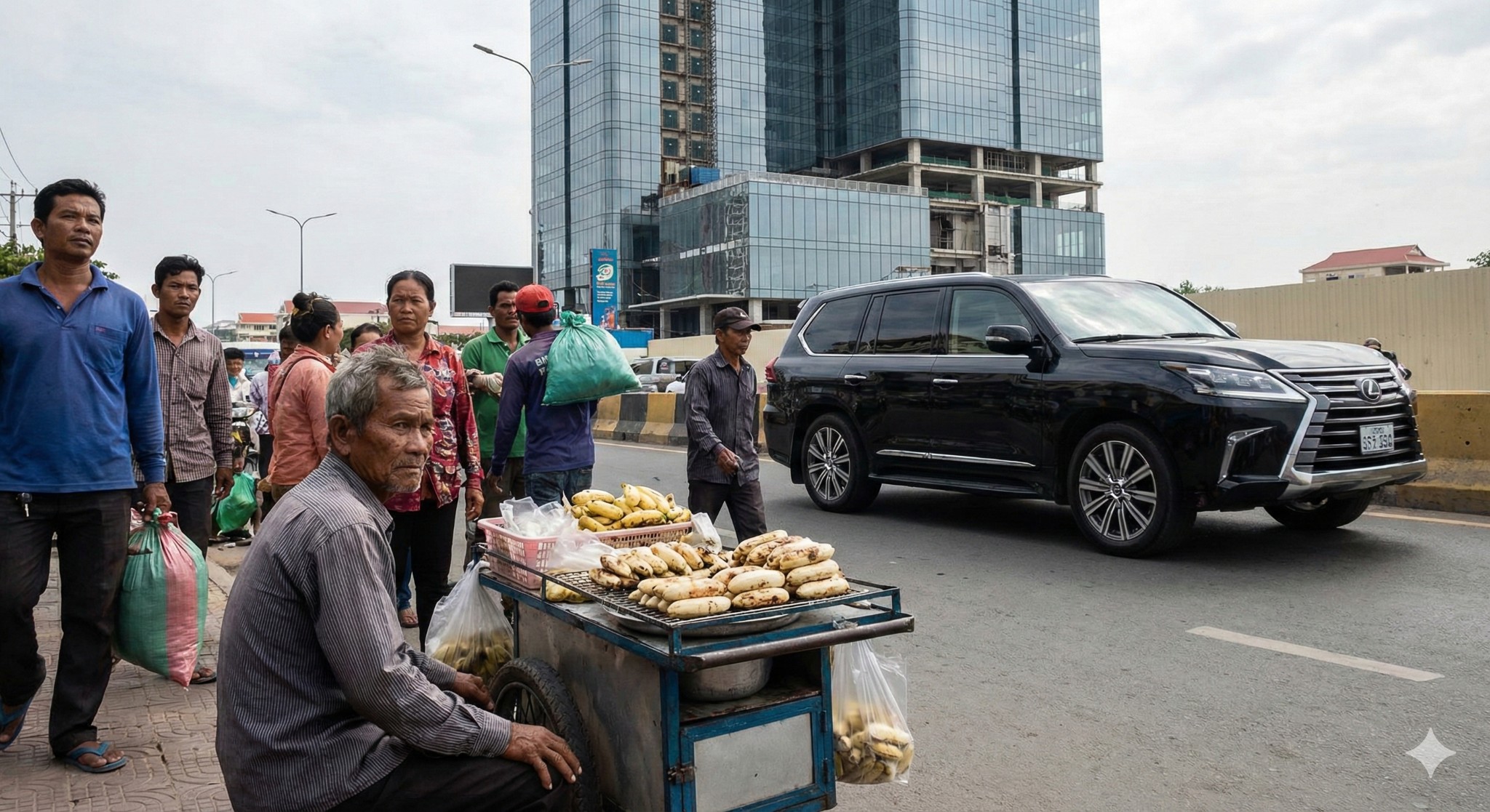 ภาพที่เห็นในพนมเปญคือมีรถหรูวิ่งเต็มถนน มีตึกสูงระฟ้า (ที่บางแห่งก็ดูร้าง) แต่พอตัดภาพไปที่ต่างจังหวัด หรือแม้แต่แรงงานที่เข้ามาไทย กลับบอกว่า "อยู่บ้านตัวเองไม่มีอะไรกิน" ค่าแรงขั้นต่ำเขาเทียบกับค่าครองชีพแล้ว มันสวนทางกันขนาดไหนครับ?