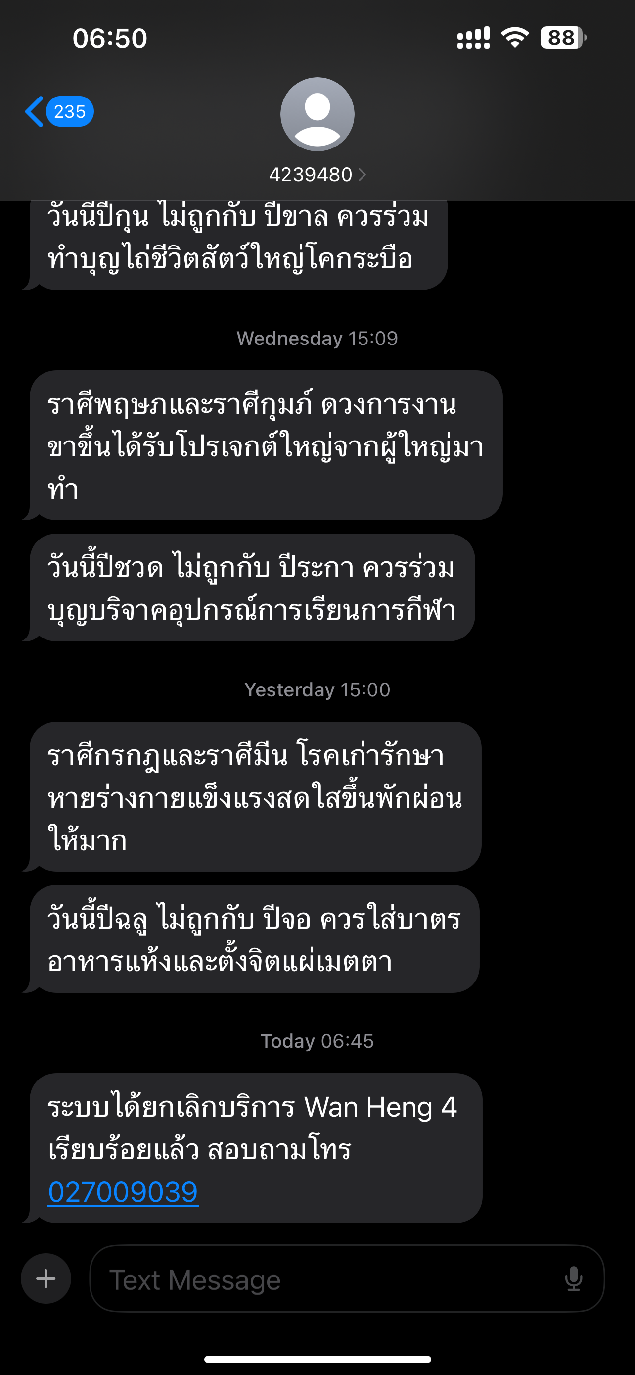 เราได้มีการกดยกเลิกโปรที่ต่ออัตโนมัติ แล้วข้อความก็ส่งมาว่าได้ทำการยกเลิกแล้ว เพราะว่าต้องต้องการจะเปลี่ยนโปรเน็ต แล้วต้องเติมเงินเข้า ทรส ทิ้งไว้ เพราะพอเน็ตหมด ก็เติมเงิน ทรส ไม่ได้ แต่พอโปรเก่าหมดแ