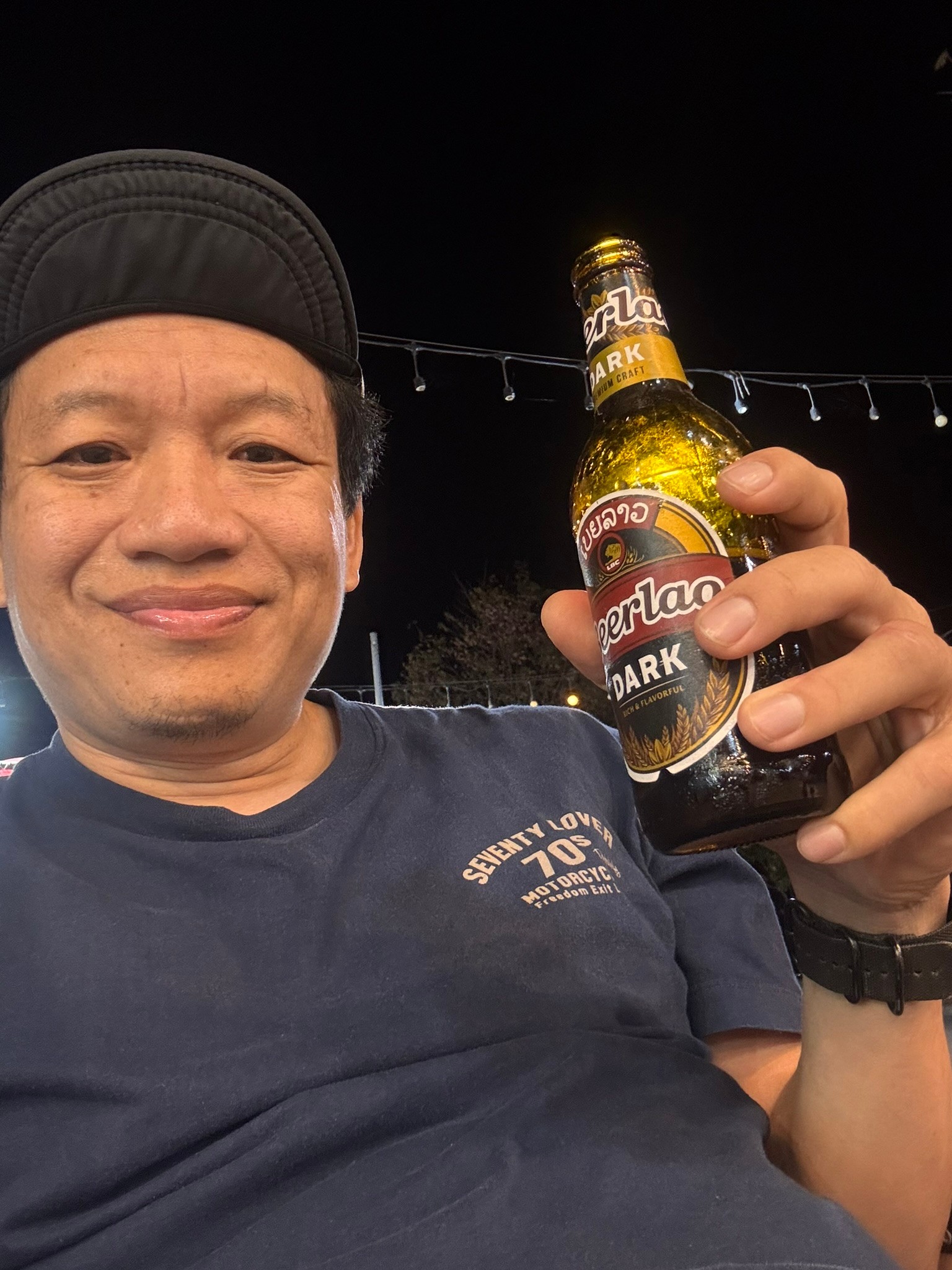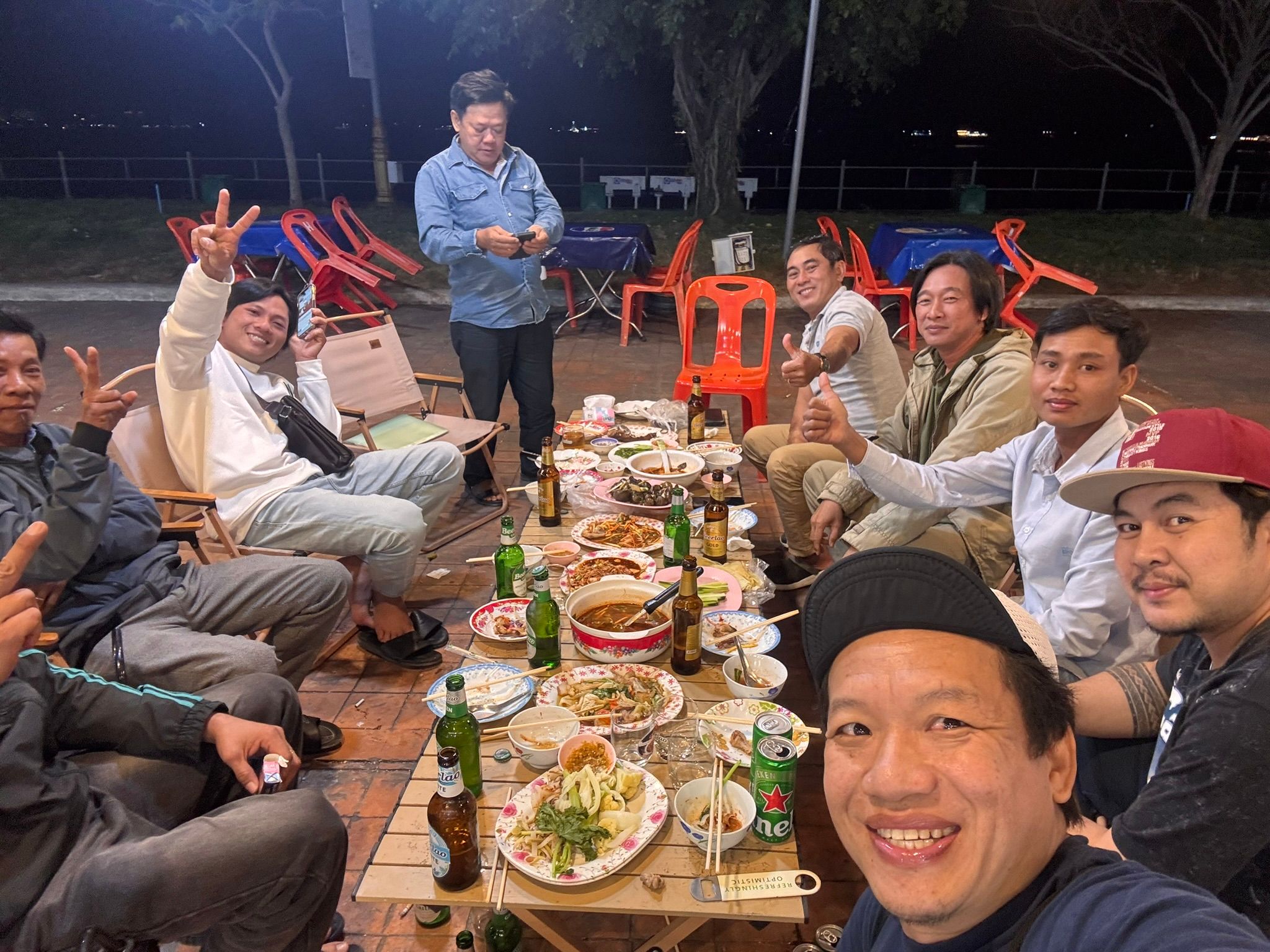 เดินร่อนไปมาหาที่นั่งดื่มสบายๆริมน้ำโขงแต่ด้วยความที่ไปคนเดียวเจอพวกพี่ๆทเวียดนามที่มาทำงานในลาวนั่งดื่มอยู่เรียกไปกินด้วยซะงั้นเอาละซิภาษายังไม่ได้จะคุยกันยังไงละทีนี้สุดท้ายก็ต้องใช้ตัวช่วยแปลภาษาในมือถือคราวนี้รู้เรื่องกันมากขึ้นคุยกันยาวยันร้านปิด เอาว่ะถือว่าซ้อมมือก่อนเจอของจริงว่ะ