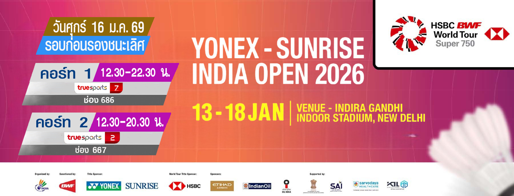 เชียร์สด ! แบดมินตันYONEX-SUNRISEIndiaOpen 2026 : รอบก่อนรองชนะเลิศ (16 ม.ค. 68) (คู่แรก 12.30 น.)