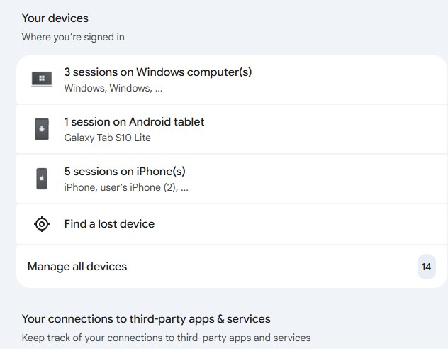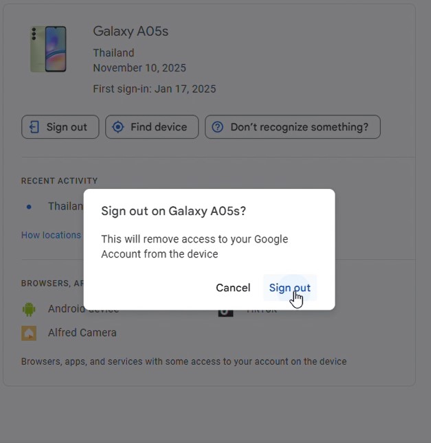 Google Account > Security & Sign-in>Your Devices>Manage All devices > เลือกอุปกรณ์ที่เราต้องการ Sign Out