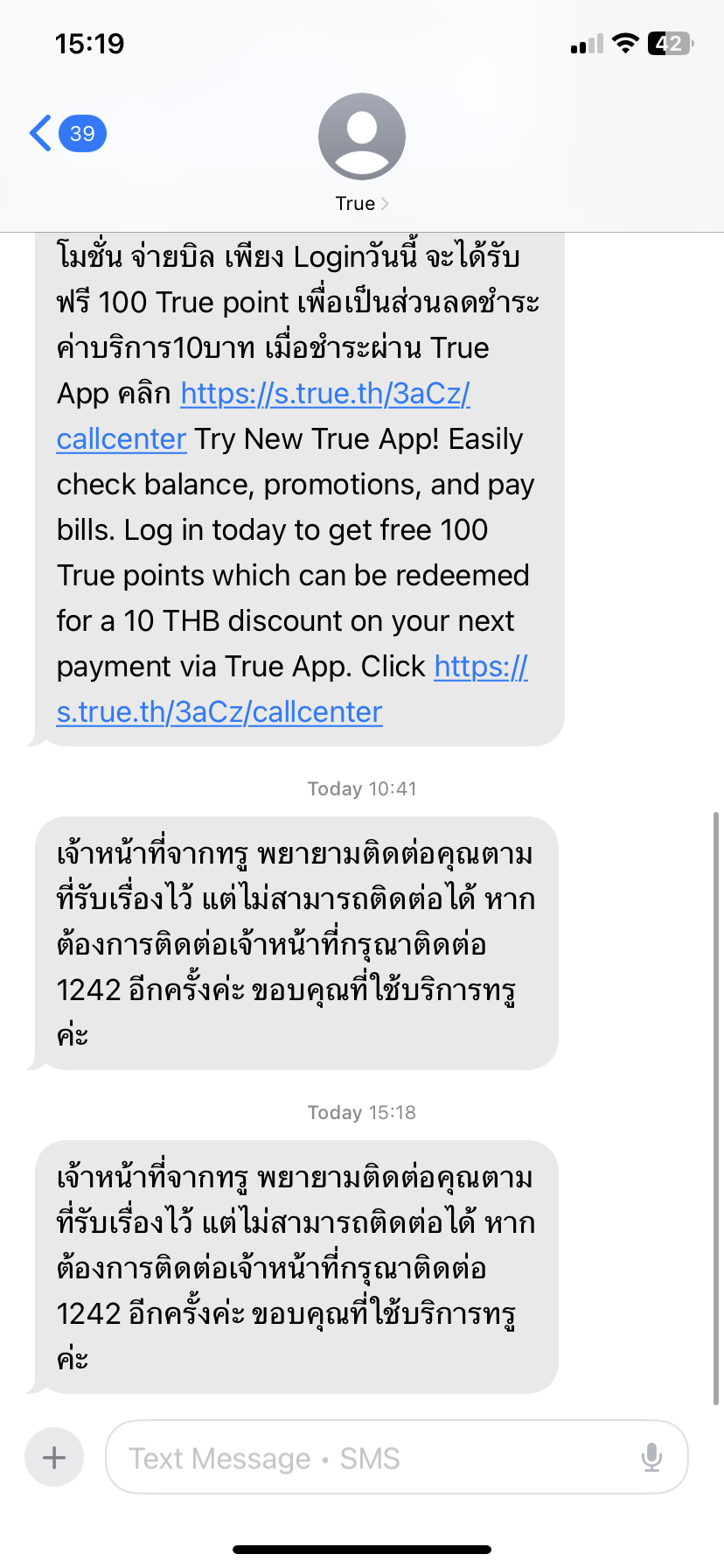 “เจ้าหน้าที่จากทรู พยายามติดต่อคุณตามที่รับเรื่องไว้ แต่ไม่สามารถติดต่อได้ หากต้องการติดต่อเจ้าหน้าที่กรุณาติดต่อ 1242 อีกครั้งค่ะ ขอบคุณที่ใช้บริการทรูค่ะ” ตามที่แนบรูปไว้