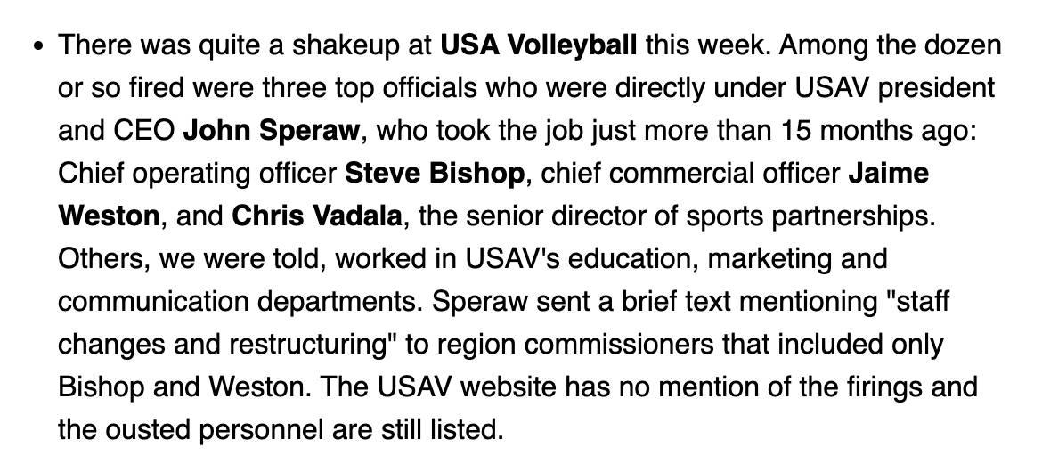 วงการบอลเลย์บอล สหรัฐอเมกา กำลังร้อนระอุ เมื่อ ลุงจอร์น ประธานฯบริหาร ปลดเจ้าหน้าที่ระดับสูง เเละหัวหน้าทีมงาน ออกอย่างไร้เหตุผลชัดเจน เเละไม่มี รายงานหรือ ประชุมสรุปผลใดๆ