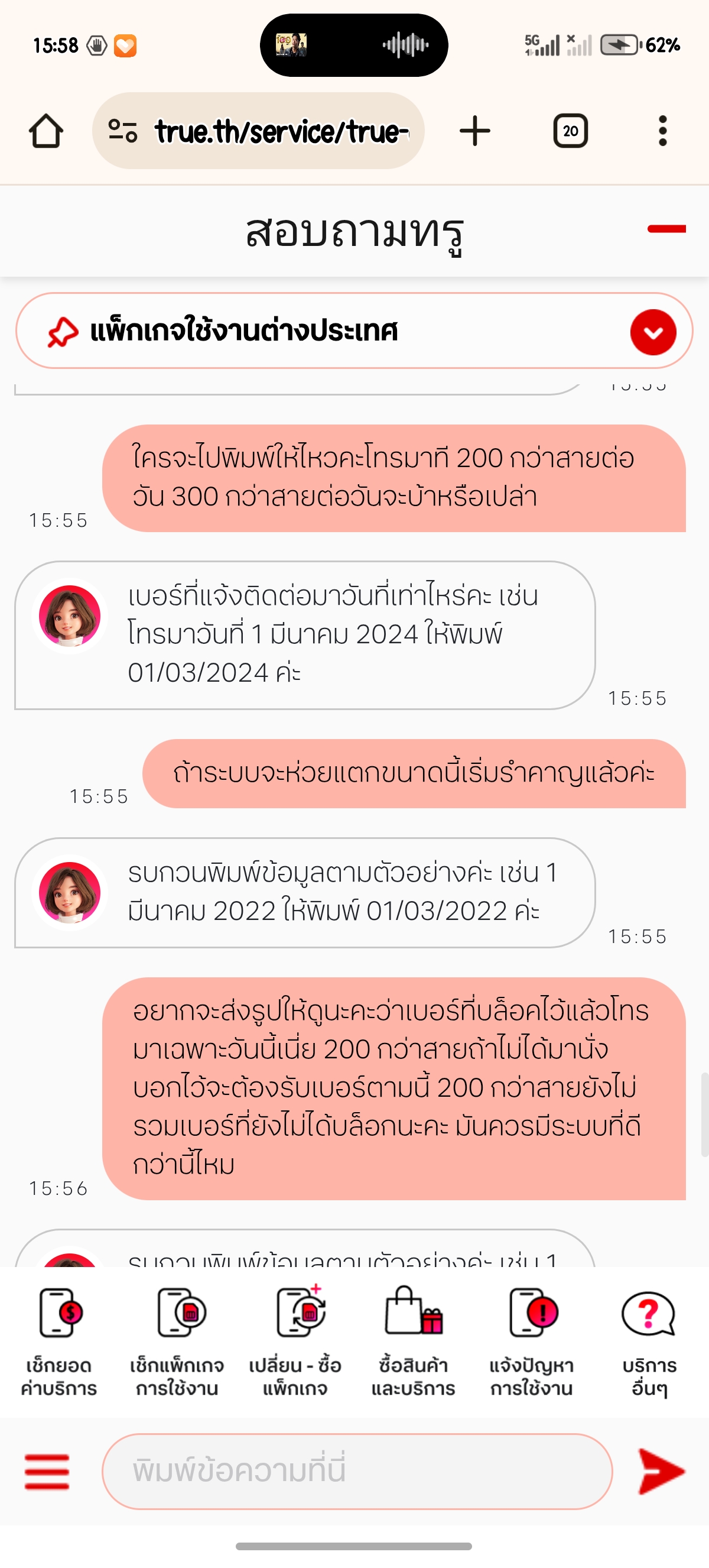 ฝากรายงานถึง Truemove H ให้ดูแลเรื่องเบอร์โทรของลูกค้าอย่าให้มีมิจฉาชีพมาขอกวนมันควรมีมาตรการของระบบที่จะป้องกันลูกค้าของตัวเองได้ดีกว่านี้ วันหนึ่งมิจฉาชีพโทรมาเกิน 200 สายก็เกินไป ขนาดเบอร์ที่บล็อกแล้วยัง 200 กว่าสาย แล้วรวมเบอร์ที่ยังไม่ได้บล็อกอีก ถ้าไม่ใช้ App ของ True call คือไม่รู้เลยต้องมานั่งรับโทรศัพท์รับแล้วรับอีก แต่พอจะป้องกันไม่ใช่พี่กลับให้สมัครรายเดือนเดือนละ 49 59 บาท มันควรเป็นความรับผิดชอบของลูกค้าหรอ มันควรเป็นความรับผิดชอบของผู้ให้บริการหรือเปล่า ทั้งโทร 1242 ทั้งโทร 9777 ก็ไม่ได้ช่วยอะไรเลย ทั้งเสียเวลาทั้งเสียอารมณ์ เบอร์โทรของลูกค้ารั่วไหลแบบนี้ ถ้าเป็นคนเฒ่าคนแก่จะใช้ชีวิตยังไง ขนาดเราเป็นวัยรุ่นซะเปล่าเรายังโดนขนาดนี้ รบกวนแก้ไขให้ตรงจุดด้วยนะคะไม่ใช่ให้ผู้ใช้บริการต้องมานั่งเสียเดือนละ 4959 มันอาจจะมองว่ามันเป็นเงินที่น้อย แต่เอาความจริงคือมันก็ไม่ควรที่จะมานั่งเสียกับเรื่องแบบนี้ ตอน นี้ คือ ไม่ เปิด เสียง โทรศัพท์ เลย พอ ต้อง มา นั่ง ระแวงกับเบอร์มิจฉาชีพ จนคนที่รู้จักบ่นว่าไม่รับเบอร์แปลก มันไม่ใช่อ่ะ ควรจะทำยังไงดี พอรายงานไป ก็ให้กรอกเบอร์ทีละเบอร์ จะบ้าหรือเปล่า ใครจะว่างขนาดนั้นคะถามหน่อย หลักฐานตามตัวอย่างเลยนะคะ