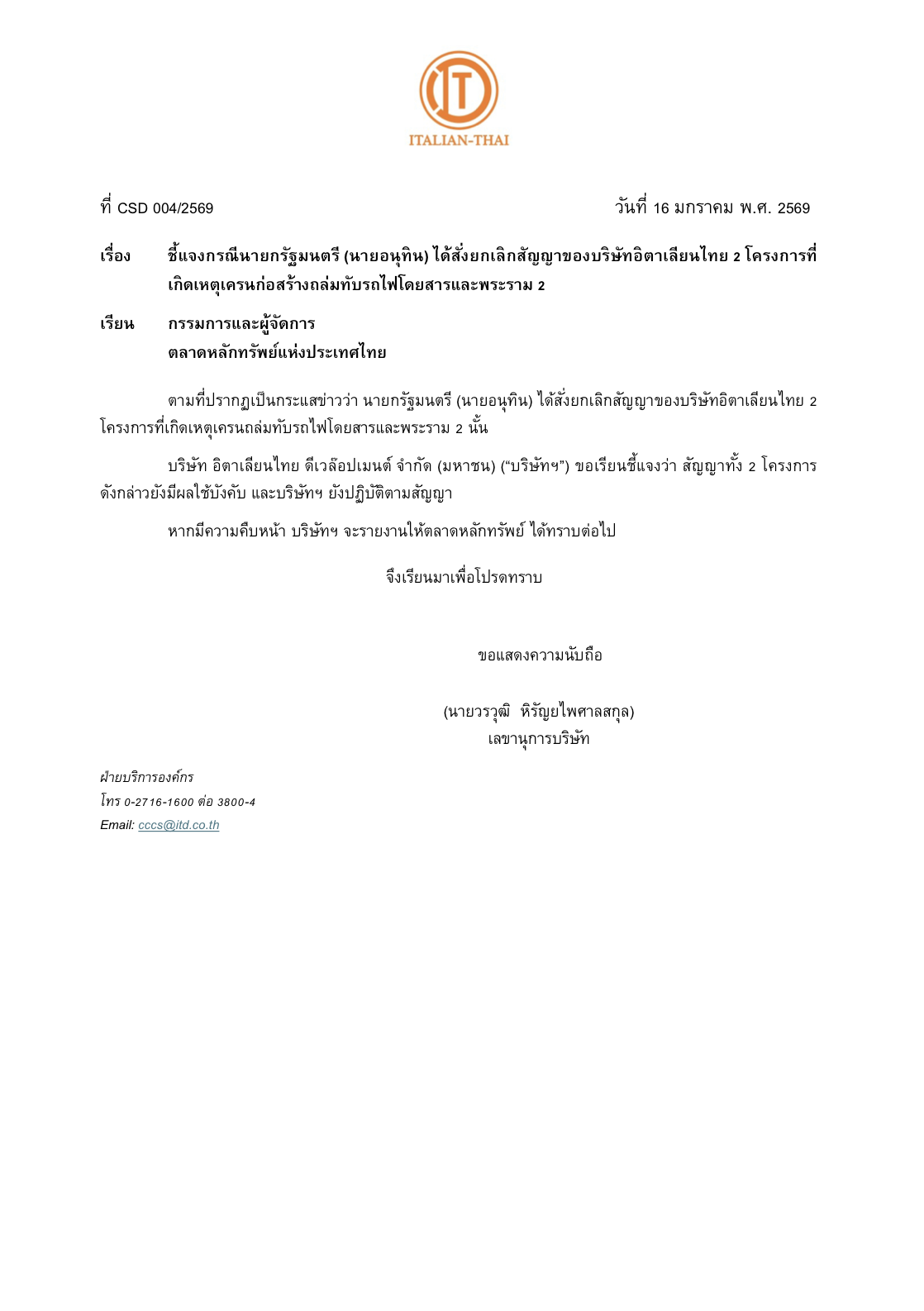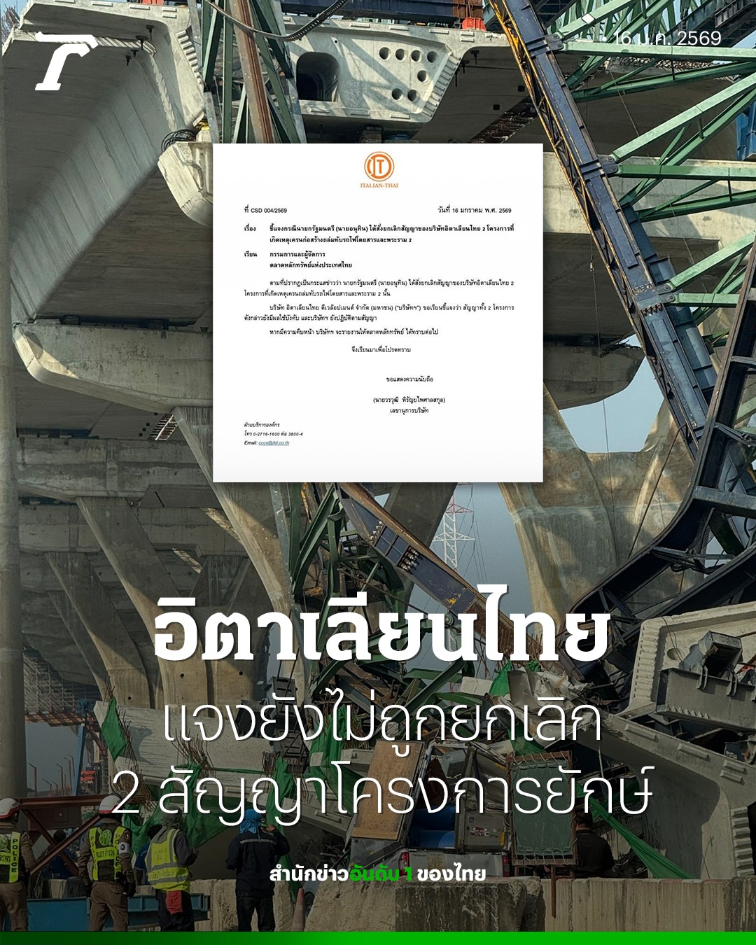 เมื่อวันที่ 16 มกราคม 2569 ผู้สื่อข่าวรายงานว่า ฝ่ายบริการองค์กร บริษัท อิตาเลียนไทย ดีเวลลอปเมนต์ จำกัด (มหาชน) ได้ทำเอกสาร ชี้แจงตลาดหลักทรัพย์แห่งประเทศไทย ใจความระบุว่า ตามที่ปรากฏเป็นกระแสข่าวว่านายกรัฐมนตรี (นายอนุทิน ชาญวีรกูล) ได้สั่งยกเลิกสัญญาของบริษัท อิตาเลียนไทย 2 โครงการที่เกิดเหตุเครนถล่มทับรถไฟโดยสารและพระราม 2 นั้น
