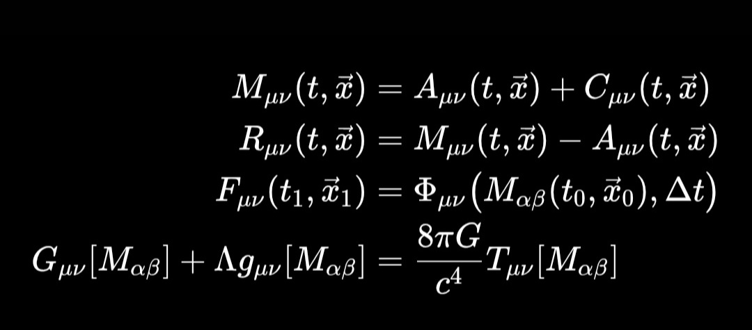 บ.4 :บรรทัดนี้ผมใช้สมการสนามของอัลเบิร์ตไอน์สไตน์โดยเพิ่ม แลมด้าg คือสสารมืด/พลังงานที่ต้องใช้โค้งงอกาลอวกาศ ส่วนgก็บอกว่าความโค้งงอตรงจุดนั้นเวลานั้นเป็นยังไงครับ :Gมิวนิว คือ ความโค้งของกาลอวกาศ