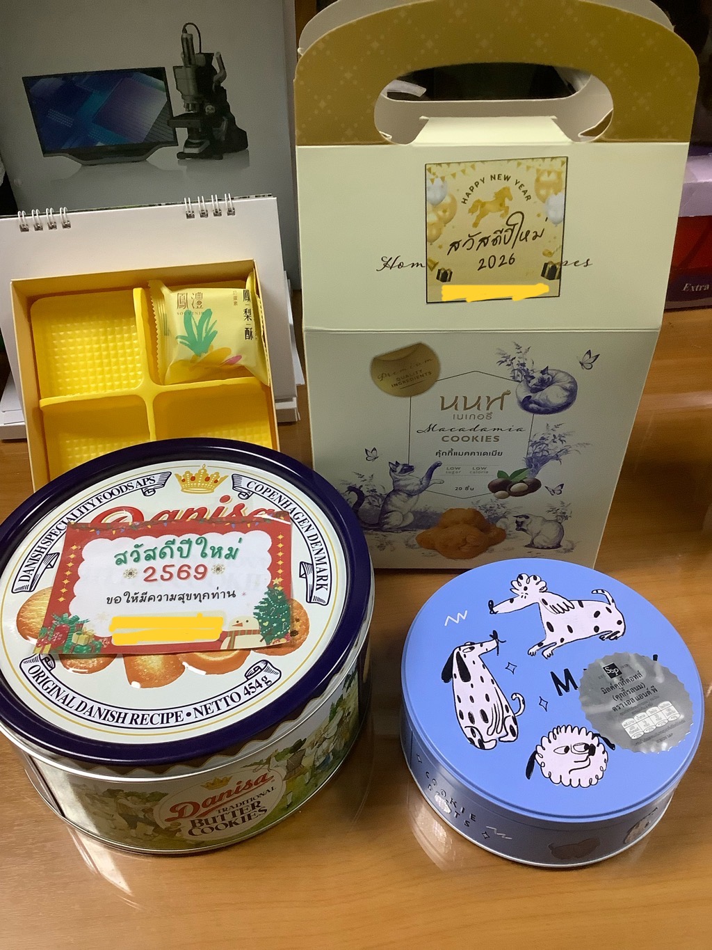ปีนี้มีดังนี้ครับ ของขวัญปีใหม่ที่มีคนหรือหน่วยงานมอบให้แก่ที่ทำงานผมครับ เอาเฉพาะที่เป็นคุ้กกี้นะ