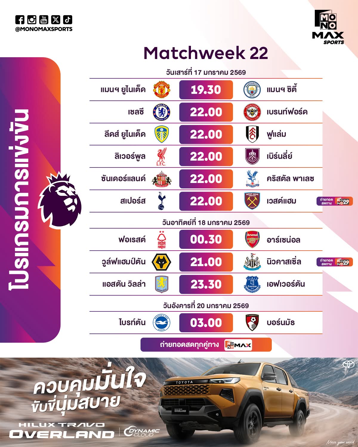 ⚽️🏴 โปรแกรม พรีเมียร์ลีก 2025/26 สัปดาห์ที่ 22 📺 #MONO29 #MONOMAX 🔴