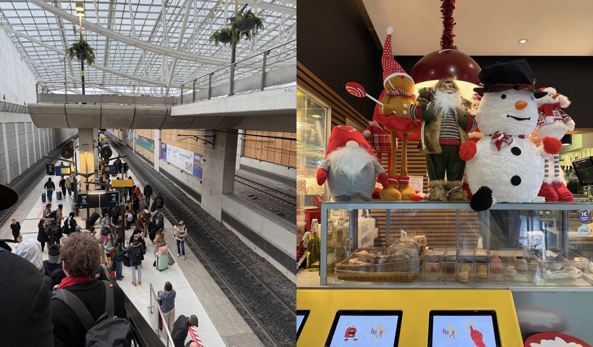 วันที่สอง ถึงสนามบินปารีสตอนหกโมงเช้า แต่ยังมืดมาก ผ่านตม.ใช้เวลาต่อคิวประมาณ 20 นาที เท่านั้น ไม่โดนถามอะไรเลย จากนั้นเรานั่งรถไฟเพื่อจะไปที่เมือง Aix-en-Provence ค่าตั๋วประมาณ 2,800 บาท เราจองใกล้วันเดินทางราคาแอบแพง จากTerminal เราเดินมาที่สถานีรถไฟประมาณ 15 นาที สะดวกมาก ออกเดินทาง 11โมง ช่วงนี้อากาศหนาวประมาณ –4 °C ที่สถานีคนเยอะมาก เพราะตรงกับช่วงคริสต์มาส หลายคนเดินทางกลับบ้านไปหาครอบครัวกัน