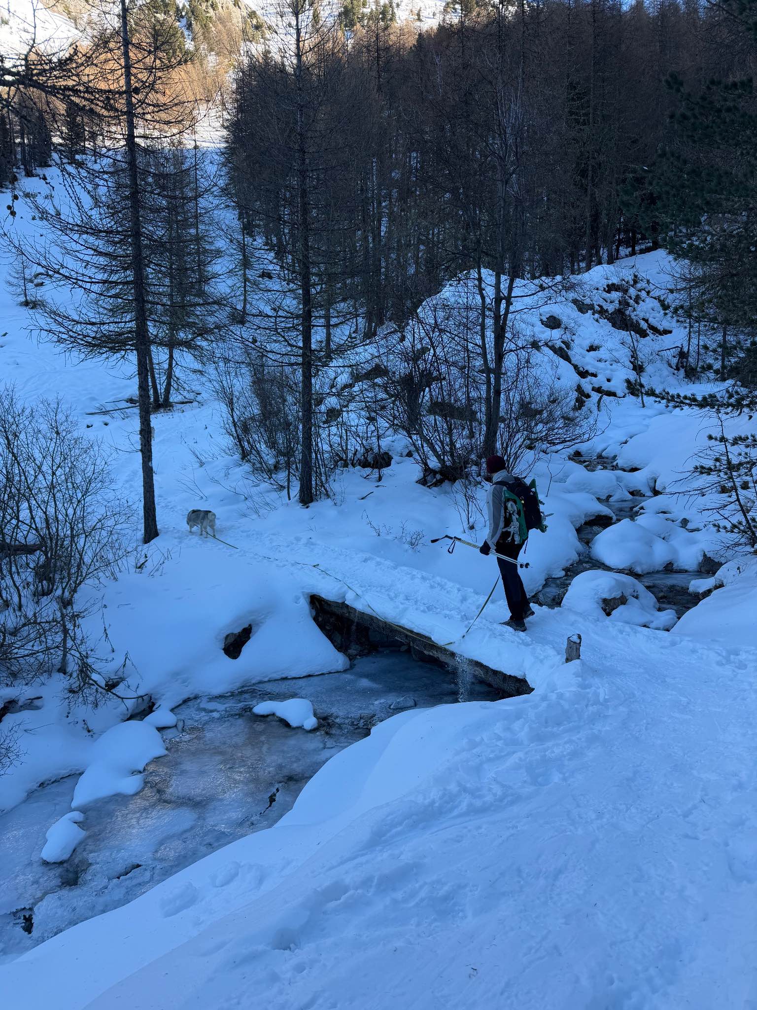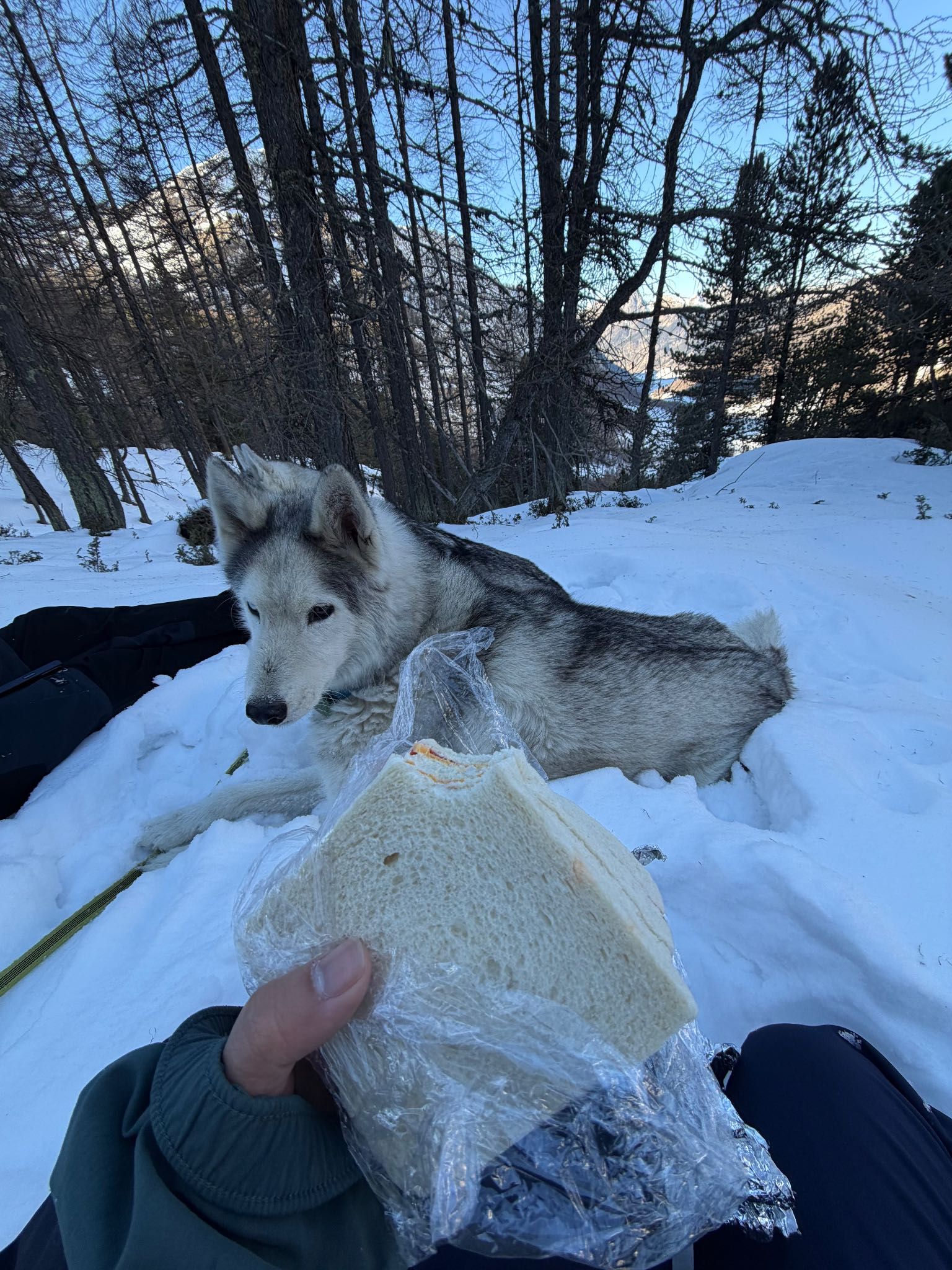 เราขับรถประมาณ 2 ชั่วโมง ไปถึงแถวที่ตั้งใจจะเดินป่า แต่ว่าหิมะสูงเกินไป รถเข้าไม่ได้ เลยต้องจอดรถไว้ข้างทาง แล้วเดินต่อไปยังจุดเริ่มต้นเทรลอีกประมาณ 3 กิโลเมตร ระหว่างเดินยังไม่ถึงเทรลจริง ๆ เราก็เริ่มหิวแล้ว แต่เอาของกินมาเยอะ เลยพักกันแปปนึง
