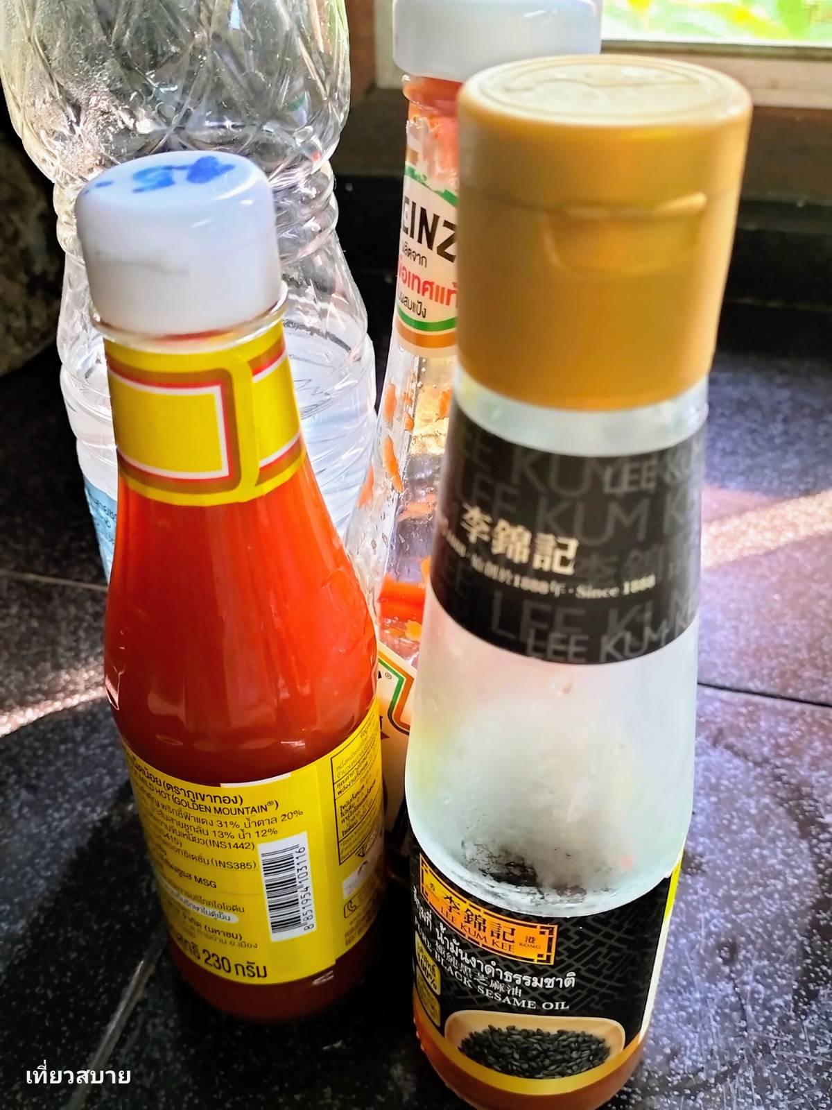 6.ซอสมะเขือเทศ, ซอสพริก, น้ำมันงา, ซีอิ๊วขาว, น้ำตาลทราย,พริกไทยป่น
