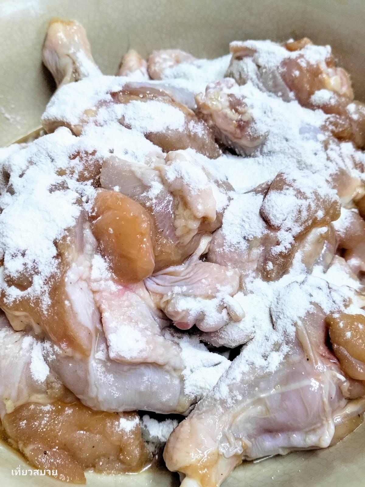 หมักไก่ด้วยซีอิ๊วขาว และพริกไทย พักไว้ประมาณ 20-30 นาที จากนั้นเอาไปคลุกกับแป้งทอดกรอบแบบแห้งๆ บางๆ ให้ทั่วค่ะ