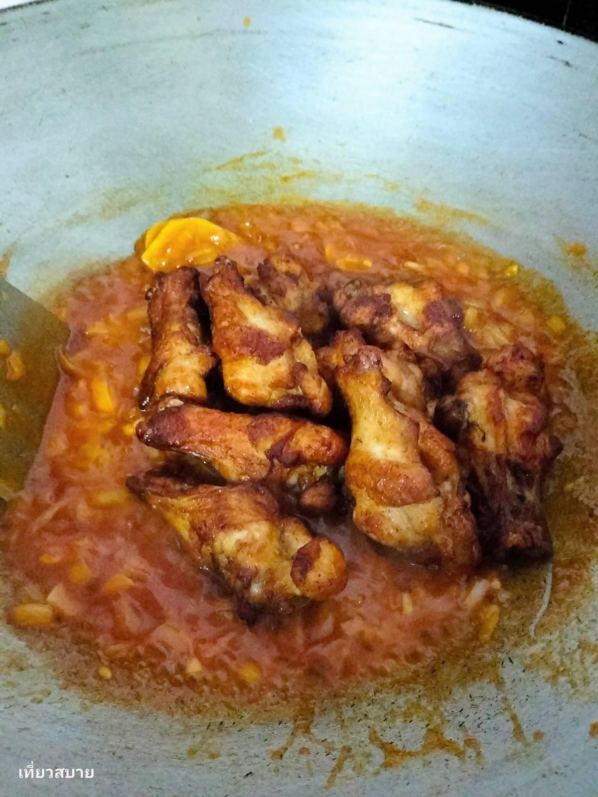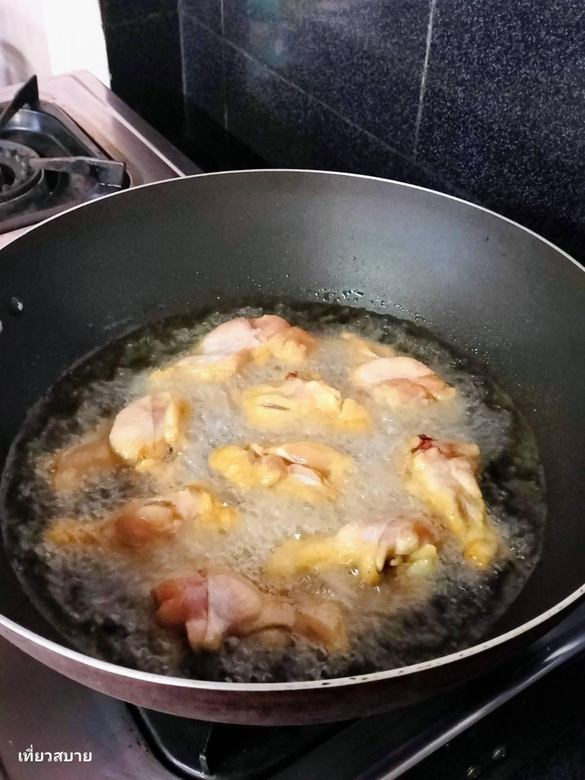 2. ตั้งกระทะให้น้ำมันร้อน นำไก่ลงไปทอดจนหนังเริ่มเปลี่ยนเป็นสีเหลืองทองและกรอบกำลังดี เสร็จแล้วตักพักไว้ให้สะเด็ดน้ำมันค่ะ