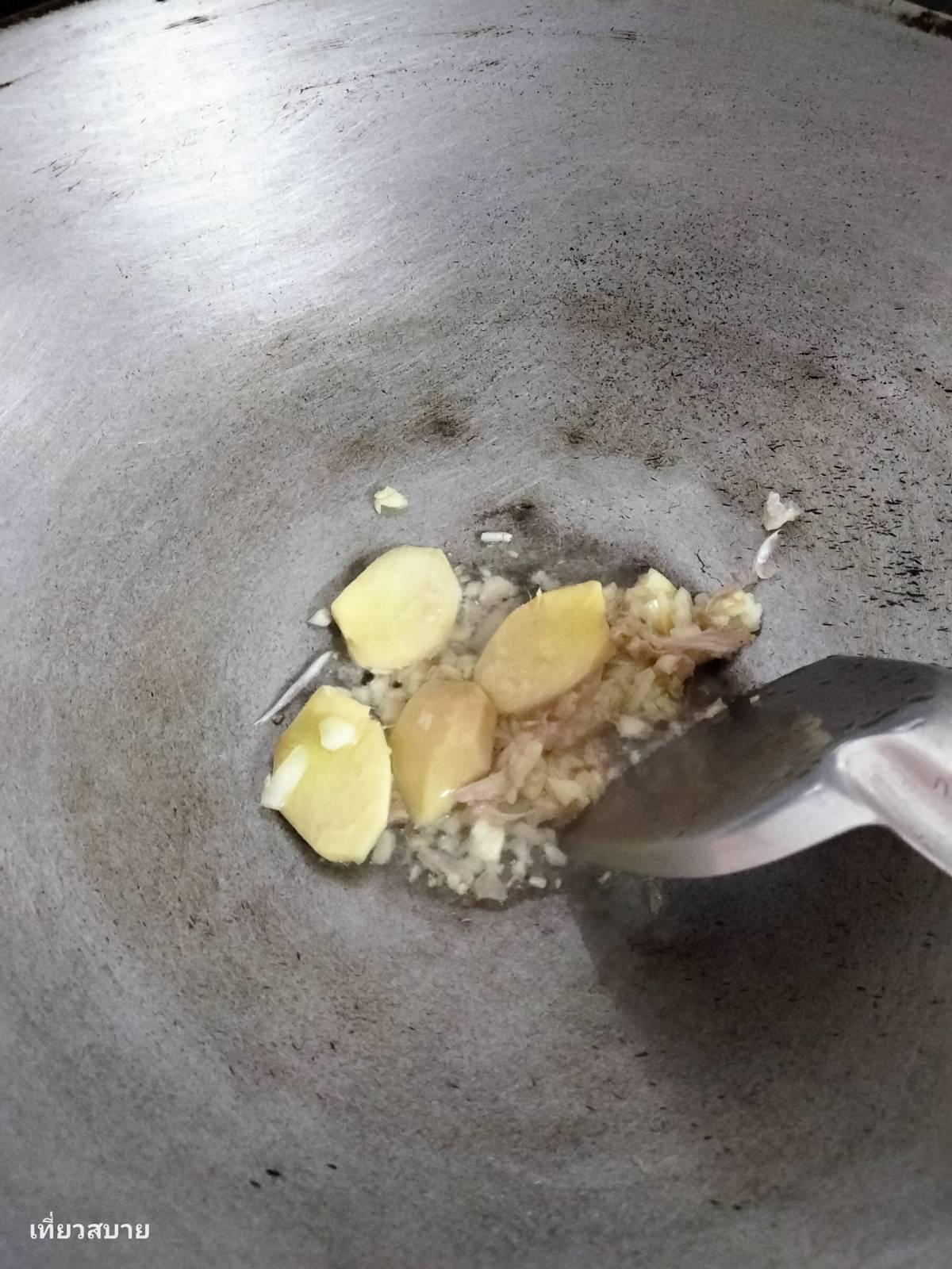 3. ตั้งกระทะ ใส่น้ำมันแค่นิดเดียวพอค่ะ ใส่กระเทียมสับและขิงฝานลงไปผัด ให้หอม ตามด้วยหอมหัวใหญ่สับ ผัดจนสุกใส