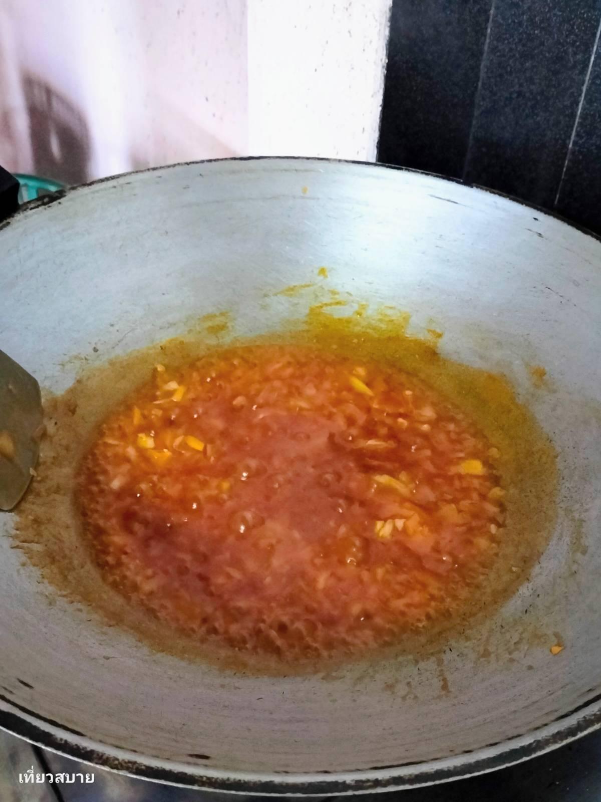 4. ใส่ซอสมะเขือเทศ ซอสพริก น้ำตาลทราย ซีอิ๊วขาว ชิมรสให้ได้ตามชอบค่ะ (หรือถ้าใครชอบเปรี้ยวจะเติมน้ำส้มสายชูลงไปสักนิดก็ได้ ) เคี่ยวด้วยไฟอ่อนจนซอสเริ่มเหนียวและเงาใส่น้ำมันงาลงไป เพิ่มความหอมค่ะ