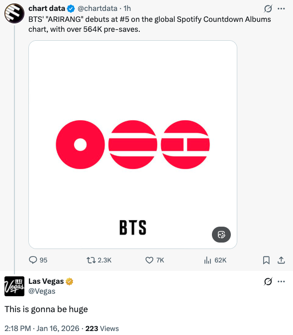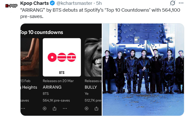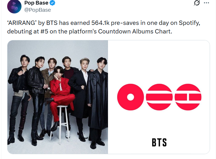 ✨อัลบั้ม 'อารีรัง' ของ BTS ทำลายยอดสถิติ Pre-save วันแรก สูงสุดเป็นประวัติการณ์บนชาร์ต Spotify Countdown Albums 🔥