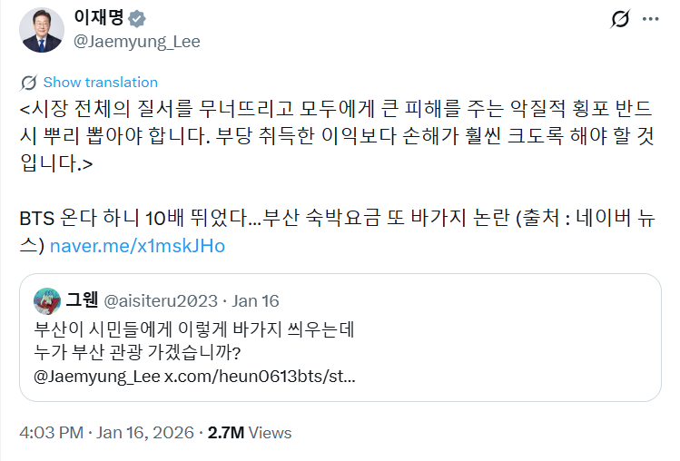 เมื่อวันที่ 16 ประธานาธิบดีอี แจมยอง ได้แชร์รายงานบน X (อดีตทวิตเตอร์) ของเขาในหัวข้อ "BTS กำลังจะมา ราคาจึงพุ่งขึ้นสิบเท่า... เกิดข้อถกเถียงเรื่องการโกงราคาในปูซานอีกครั้ง" และกล่าวว่า "เราต้องกำจัดความอยุติธรรมที่ชั่วร้ายนี้ที่ทำลายระเบียบของตลาดทั้งหมดและก่อให้เกิดความเสียหายอย่างใหญ่หลวงต่อทุกคน"