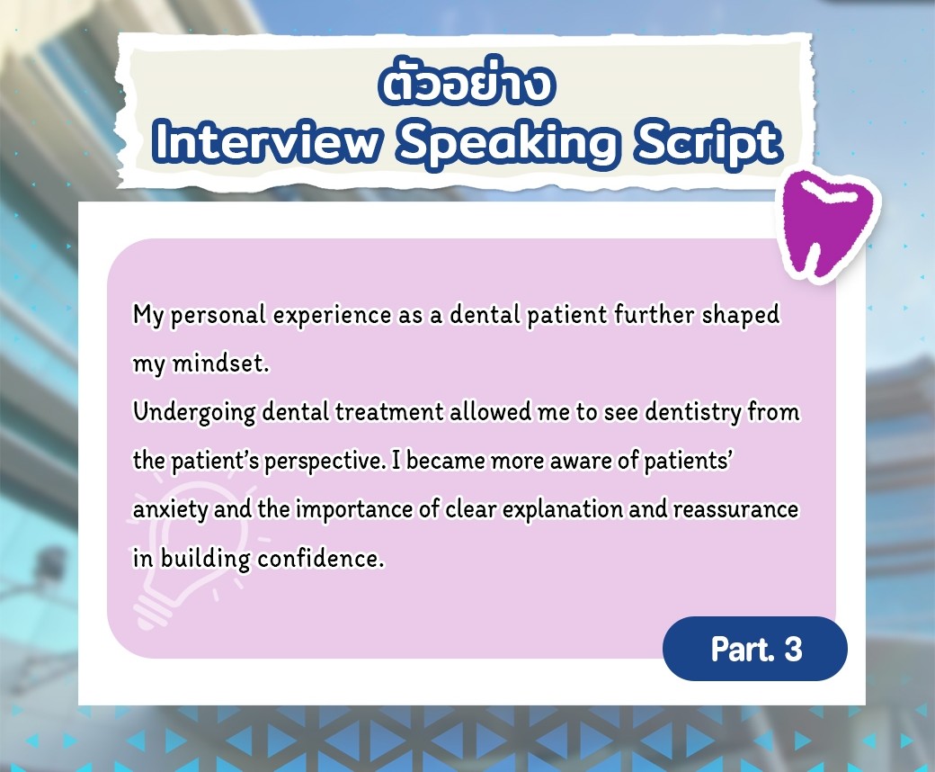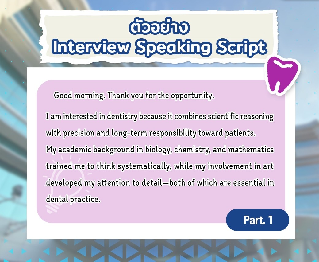• Part 1: Introduction & Interest เริ่มด้วยการทักทายอย่างเป็นทางการ และบอกเหตุผลว่าทำไมถึงอยากเรียนทันตะ โดยเชื่อมโยงพื้นฐานวิทย์ (Systematic thinking) เข้ากับศิลปะ (Attention to detail) ซึ่งเป็นหัวใจของทันตะ