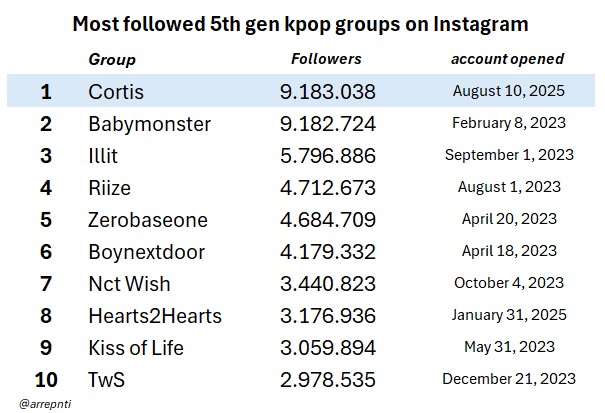 หลังจากเปิดบัญชีได้เพียงประมาณ 5 เดือน CORTIS ก็กลายเป็นกลุ่ม K-POP เจน 5 ที่มีผู้ติดตามมากที่สุดบน Instagram!