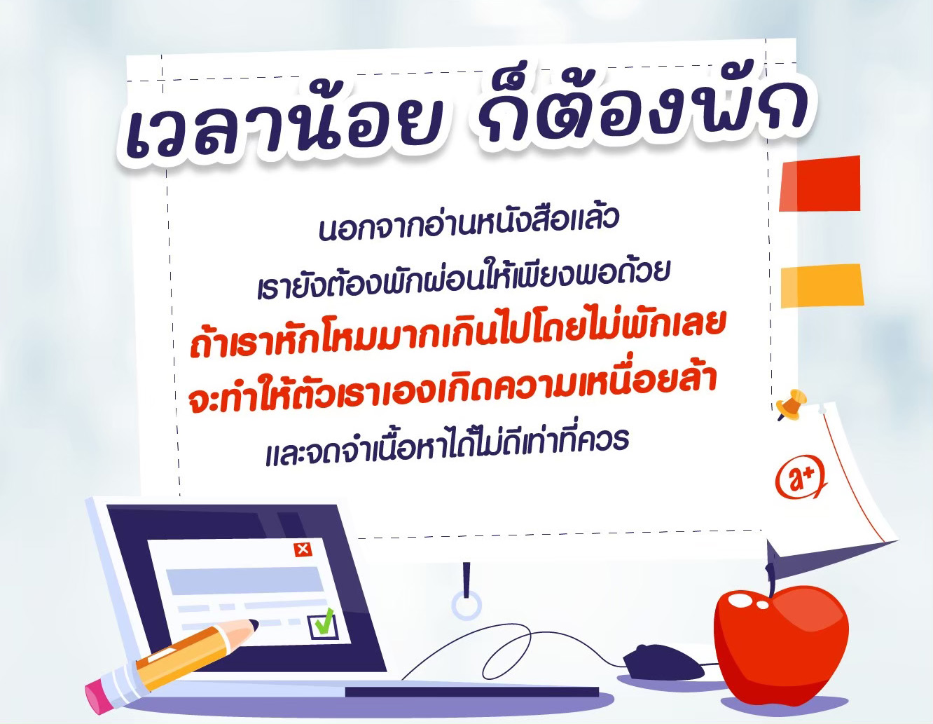 การพักเป็นระยะจะช่วยลดความเหนื่อยล้า และเพิ่มสมาธิในการอ่านแต่ละครั้ง